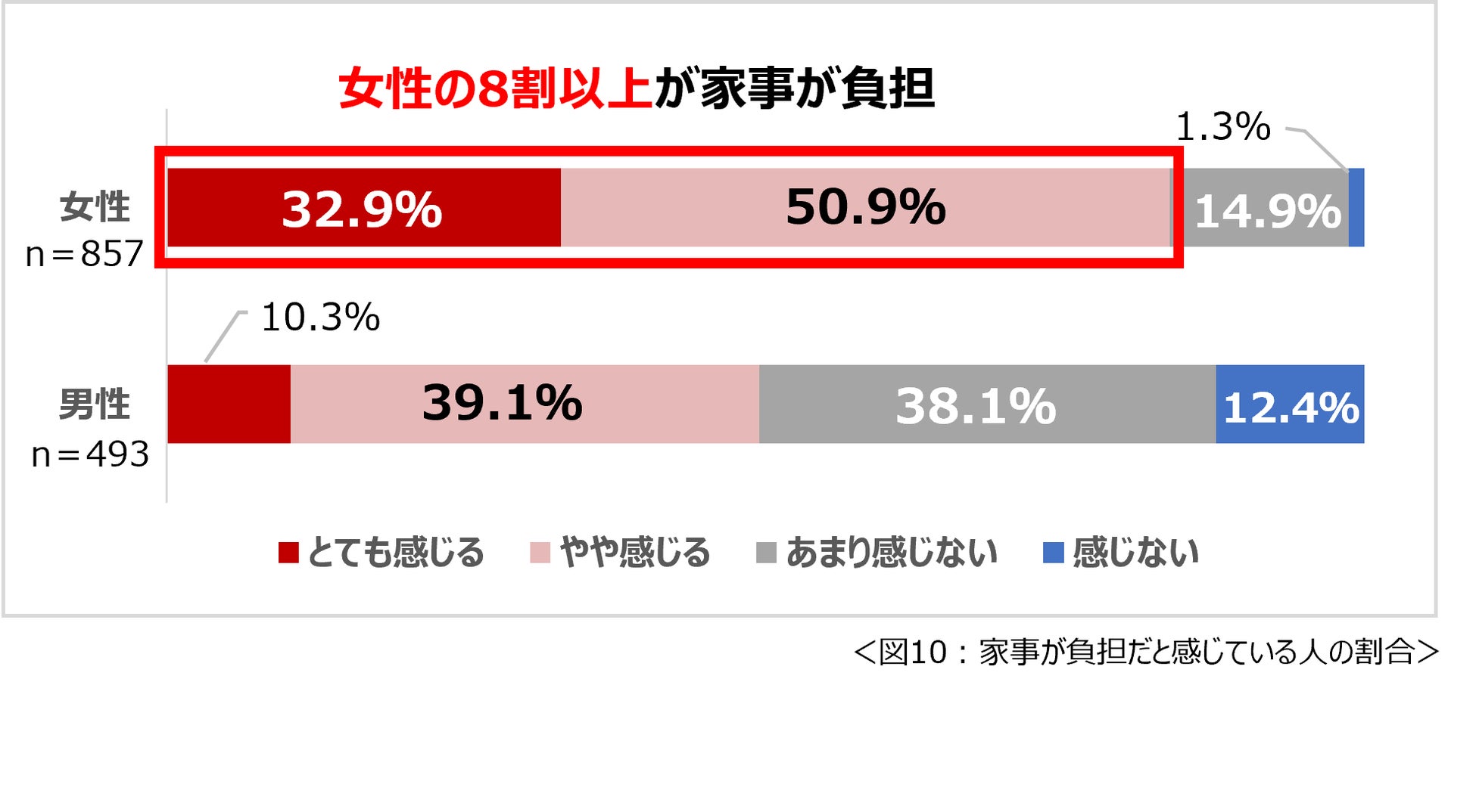 「家事が負担だと感じたことはありますか」という問いに対しては、「とても感じる」、「やや感じる」を合わせると、女性の8割以上が負担と感じていることがわかりました。(図10)