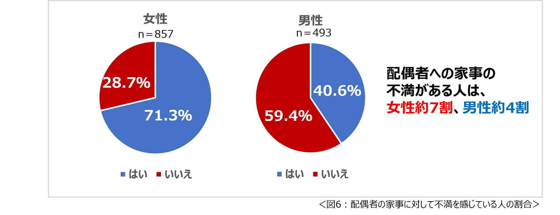 「配偶者が行った家事に対して、不満や気になる点はありますか」という問いに対して、「はい」と回答した人が、女性は約7割、男性は約4割で、女性の方が配偶者の家事に対しての不満を感じていることがわかりました。(図6)