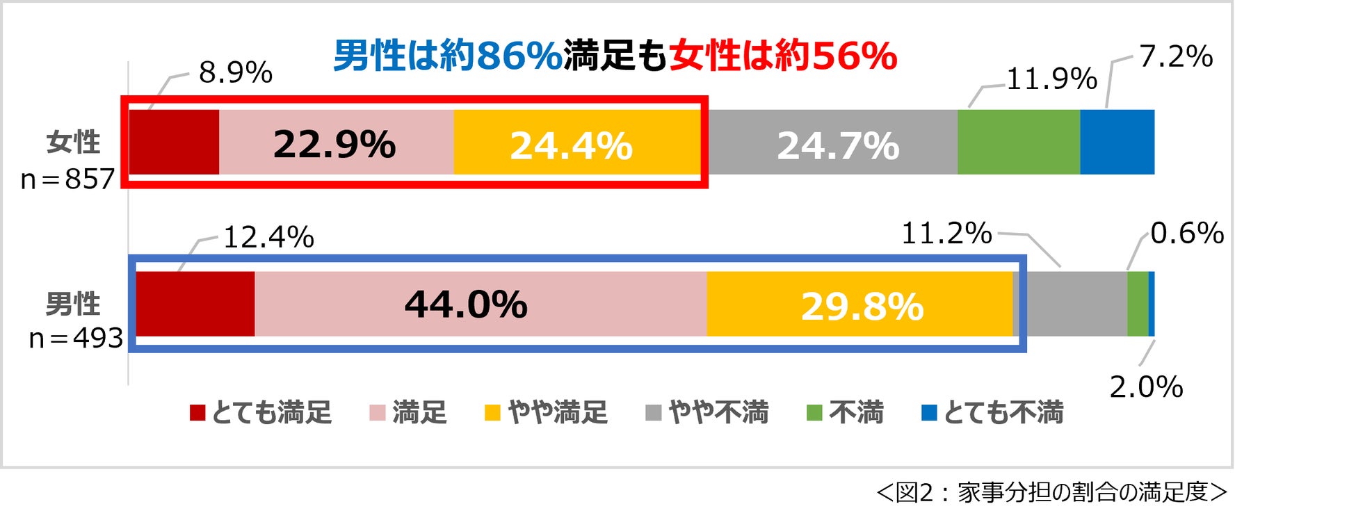 「家事の分担の割合に対して、満足していますか」という質問に、男性は「とても満足」12.4%、「満足」44.0%、「やや満足」29.8%と、約86%の人が家事分担に満足している一方で、女性は「とても満足」8.9%、「満足」22.9%、「やや満足」24.4%と、約56%まで下がることがわかりました。(図2)
