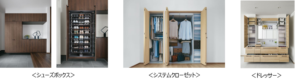 大容量でバリエーションも豊富だから、あらゆるエリアで、仕舞いたいものにぴったりの設備・収納をお選びいただけます。備え付けで部屋がスッキリするため、掃除の負担も軽くなります。