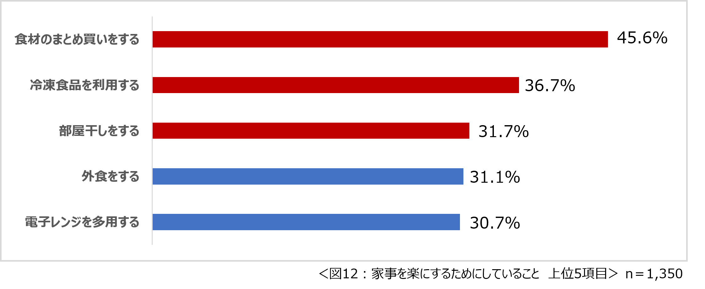 続いて「家事を楽にするためにしていることはありますか」という質問に対しては、1位「食材のまとめ買いをする」、2位「冷凍食品を利用する」、3位「部屋干しをする」という結果になりました。(図12)