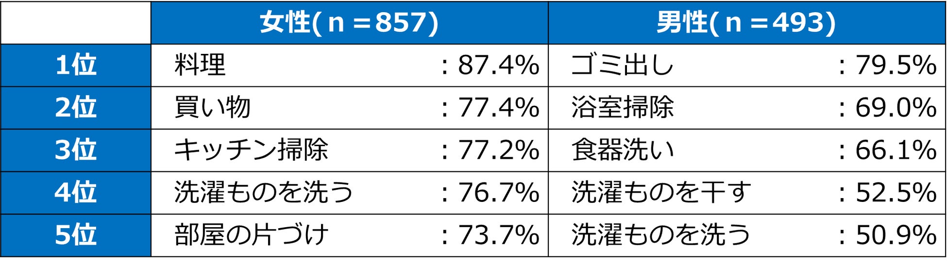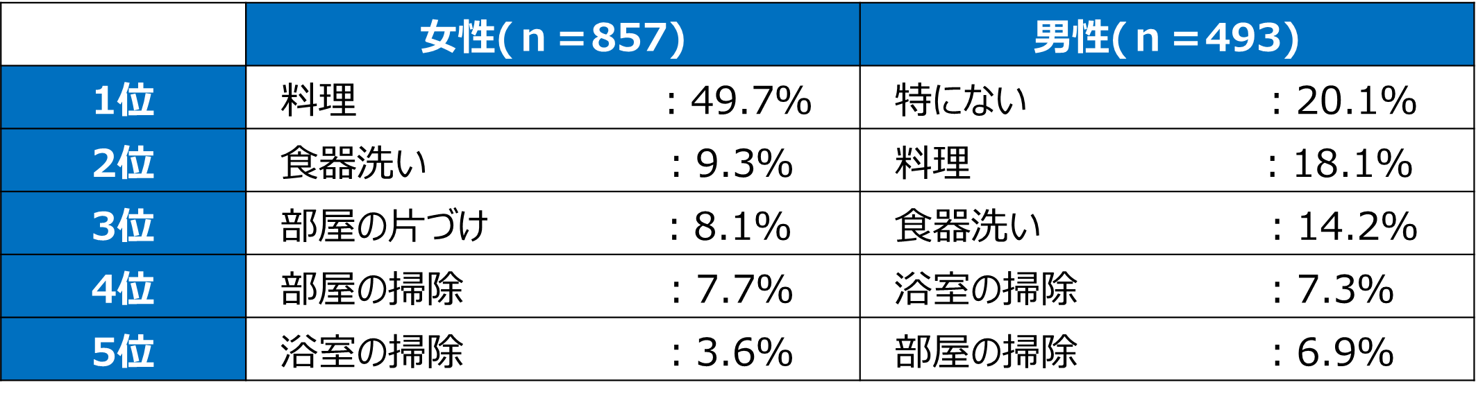 ■主に担当している家事は、女性:1位「料理」、2位「買い物」、3位「キッチン掃除」、