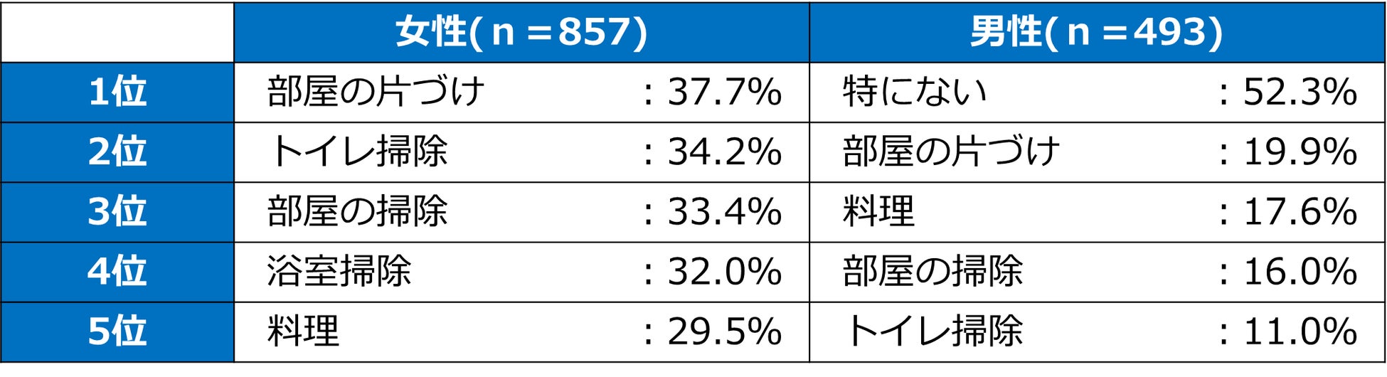 「配偶者にもっと担当してもらいたい家事」を尋ねたところ、女性の回答第1位は「部屋の片づけ」、2位「トイレ掃除」、3位「部屋の掃除」でした。一方、男性は半数以上が回答した「特にない」が1位となりました。(図5)