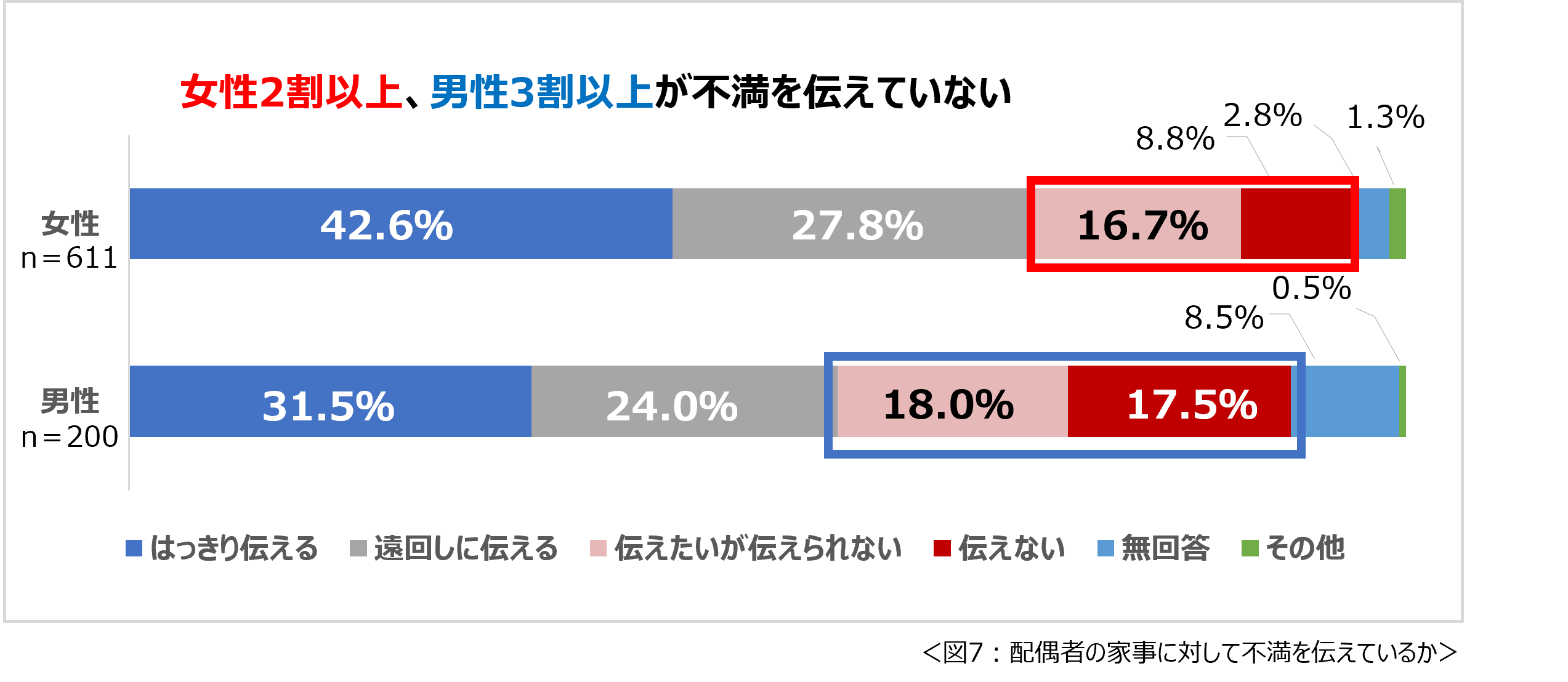 配偶者の家事に不満を感じている女性は約7割に対し、男性は約4割。そのうち、家事の不満を配偶者に伝えていない人は、女性 2割以上、男性は3割以上