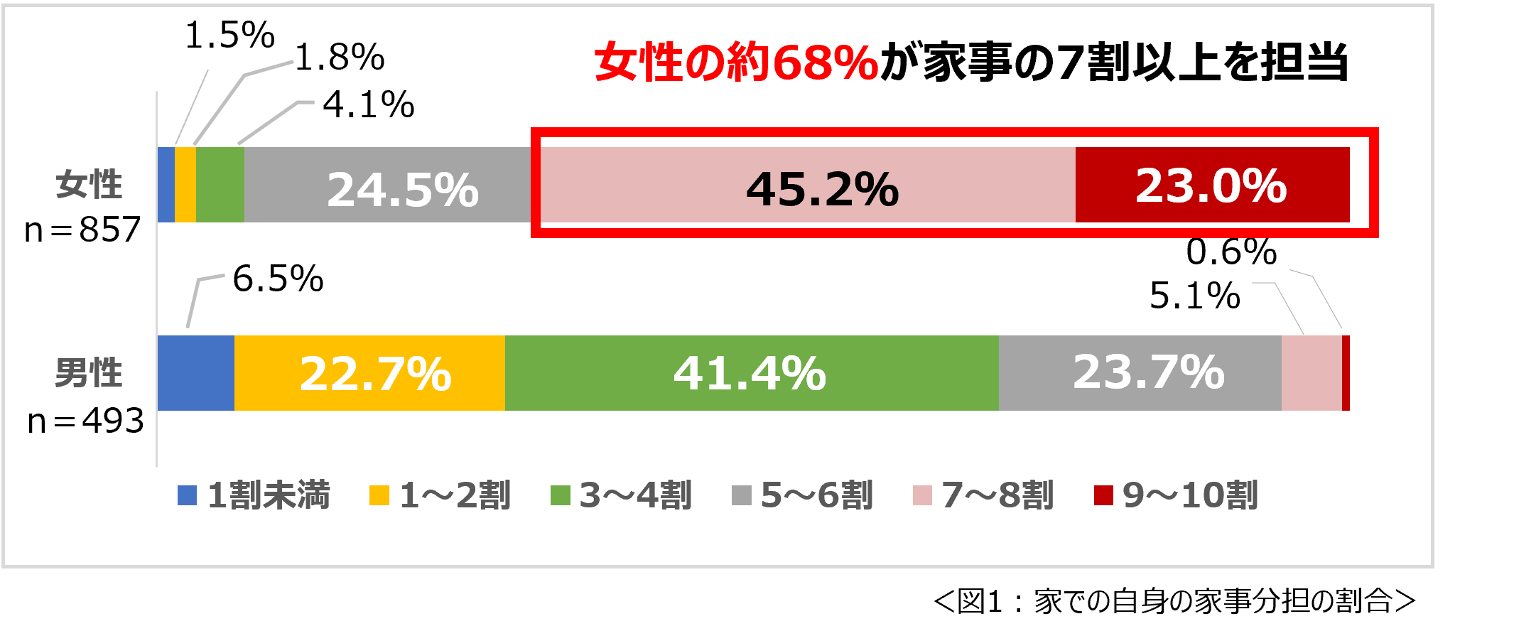 既婚共働き男女1,350名に、「家での自身の家事分担の割合はどのくらいですか」と尋ねたところ、女性の約68%が家事の7割以上を担当していることがわかりました。(図1)