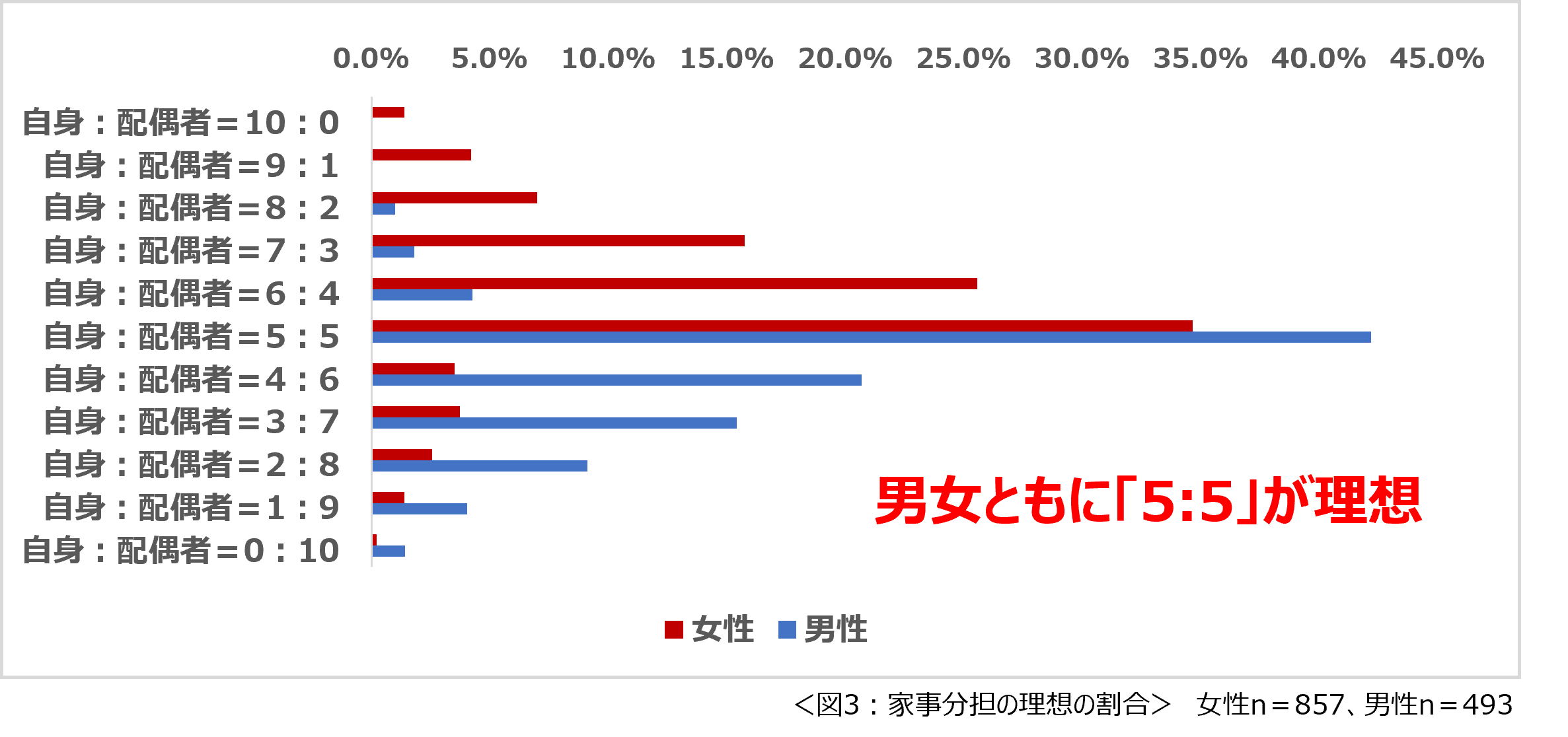 「家事の分担の理想の割合はどのくらいですか」という問いに対して、男性女性とも1位は「自身:配偶者=5:5」で、女性の34.7%、男性の42.2%が回答しました。また、自身の割合を「6割以上」と選択した女性は半数以上いることがわかりました。(図3)