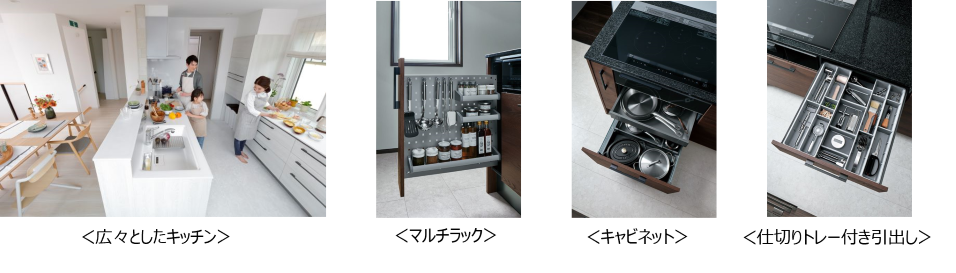 広々としたキッチン&カップボードで、盛り付けも一時置きも余裕のあるスペースで行えるため調理の効率がアップします。また、大きなキッチン道具などが十分仕舞える収納があり、必要な調味料や調理器具、食器など、ほしいときにほしいものがすぐ取れるよう、引出し内部も工夫されています。