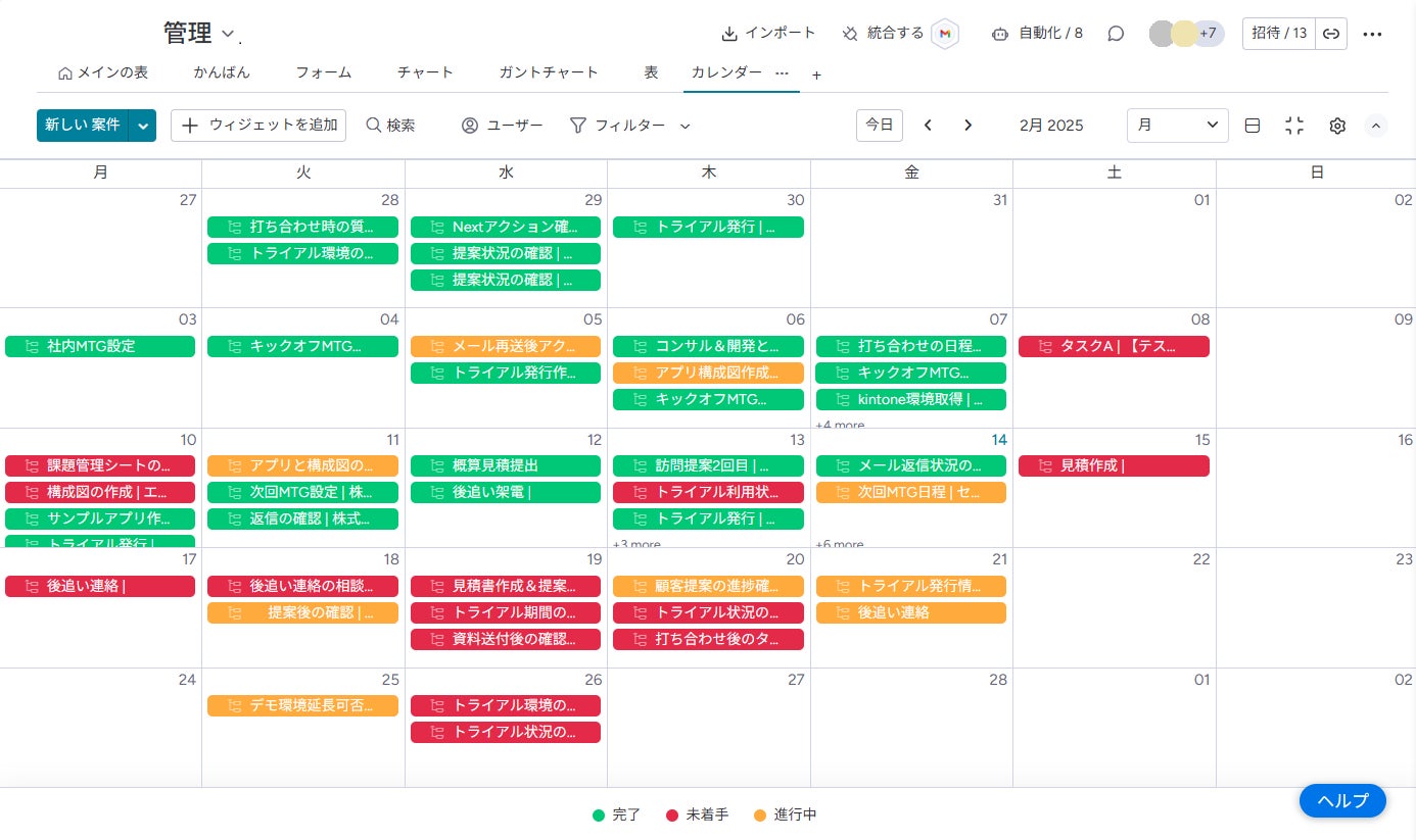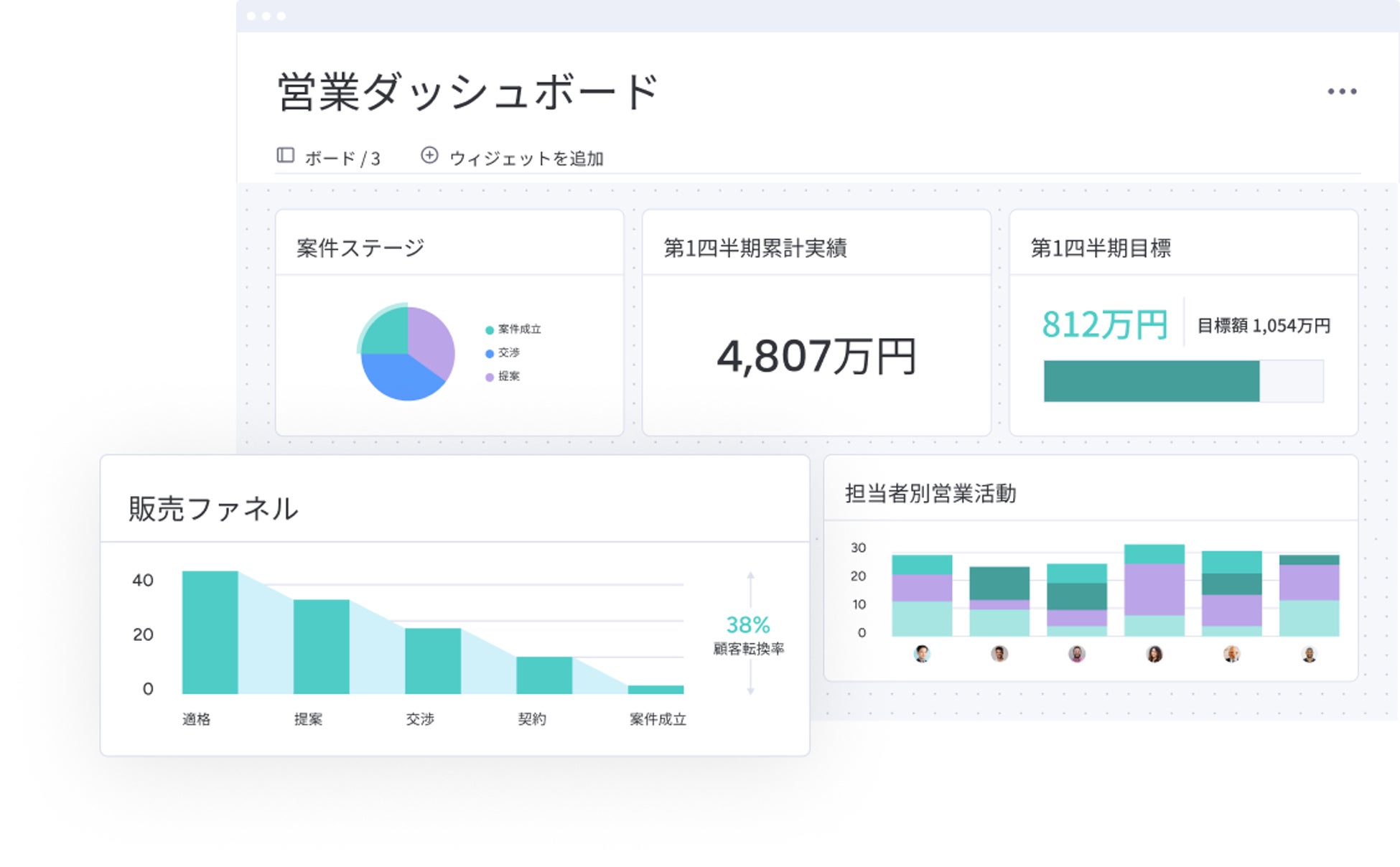 ダッシュボード機能:複数のデータを統合し、リアルタイムにデータを可視化。グラフやウィジェットを活用して進捗や業務の負荷を一目で把握でき、迅速な意思決定をサポート