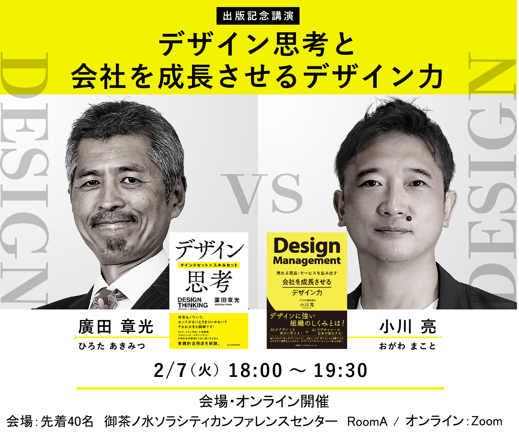 株式会社プラグ(本社:東京都千代田区) は2月7日(火)18時~19時半に、近畿大学 廣田章光教授の書籍「デザイン思考」と代表 小川亮の「会社を成長させるデザイン力」の出版を記念して、対談形式の無料講演会を開催します。