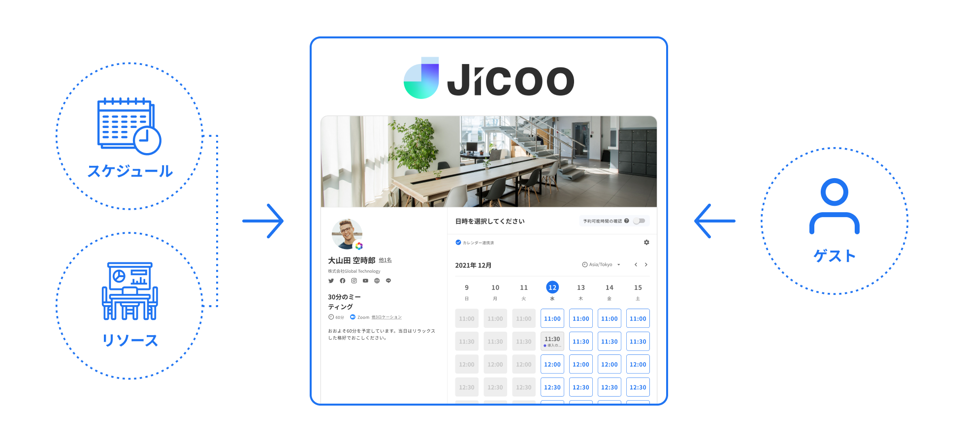 今回Google Workspace連携に対応し、Jicooの予約ページで日程調整が完了すると会議室などスペース・設備の予約も同時にまとめて行うことができるリソース機能の提供を開始いたします。