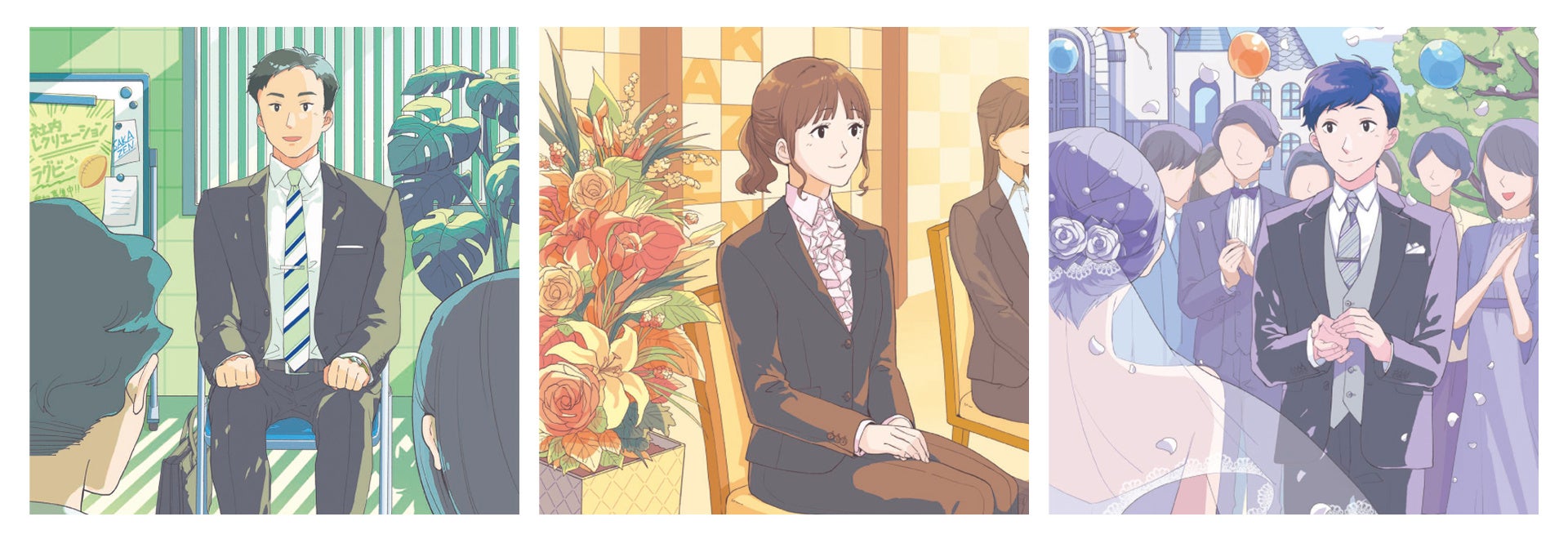 新社会人になる不安やワクワクを一人一人に焦点を当ててストーリー仕立てで表現。シーン別に適した着こなしを紹介しているほか、ビジネススーツだけでなく“大事な日に大事な服”としてフォーマルスーツについても紹介しています。