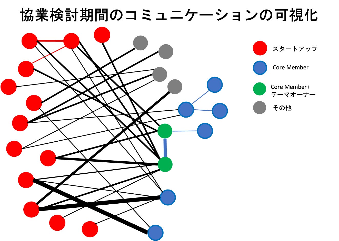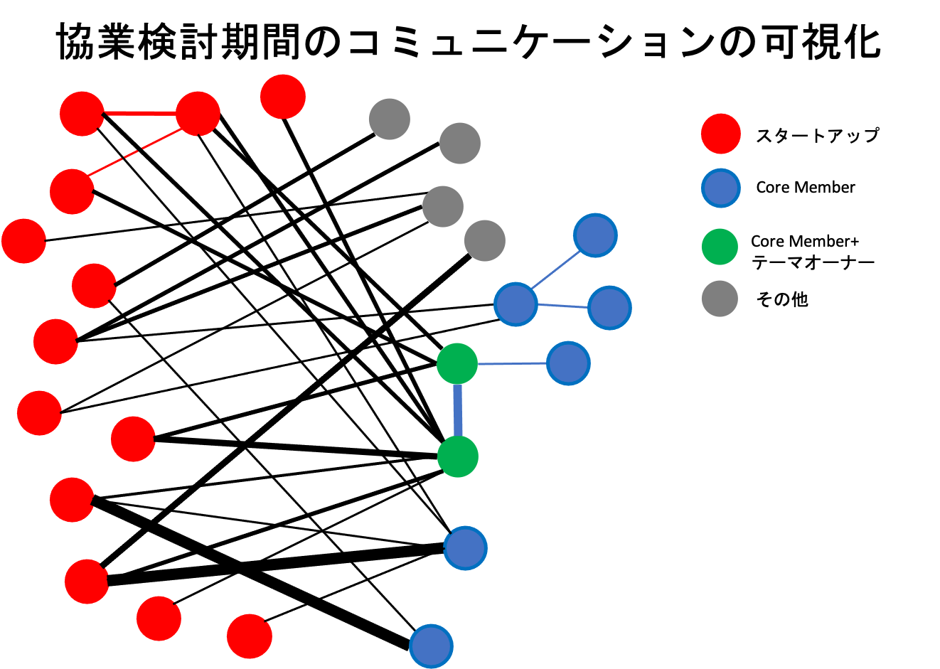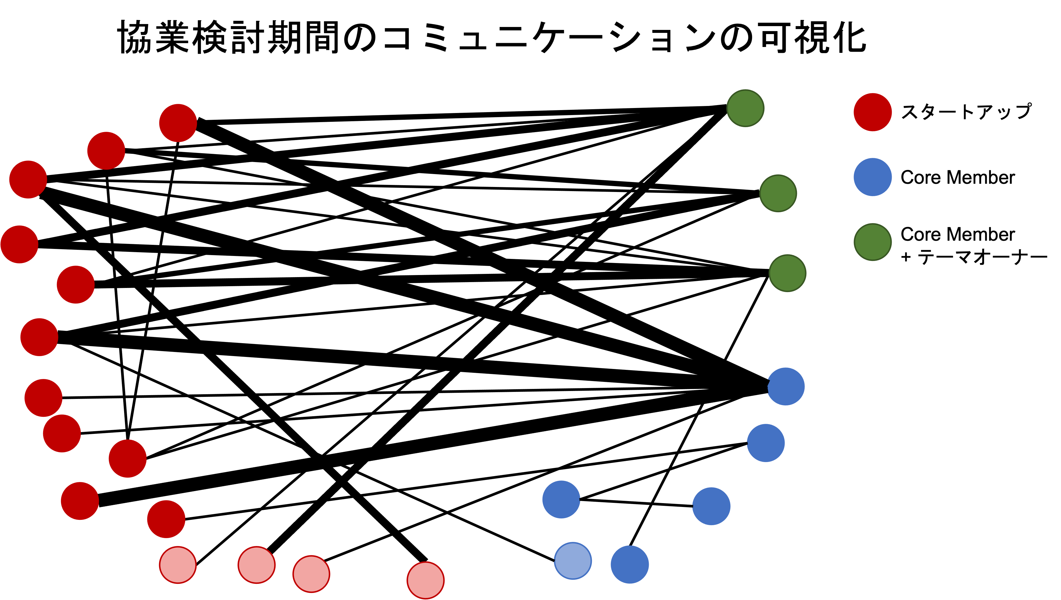 スタートアップピッチに続く協業検討期間では、参加するスタートアップと事業会社の間で2ヶ月あまりの期間で90回以上の協業検討が行われました。スタートアップと事業会社がそれぞれ複数の相手と連絡をとり、同時多発的なコミュケーションが多くうまれていました。