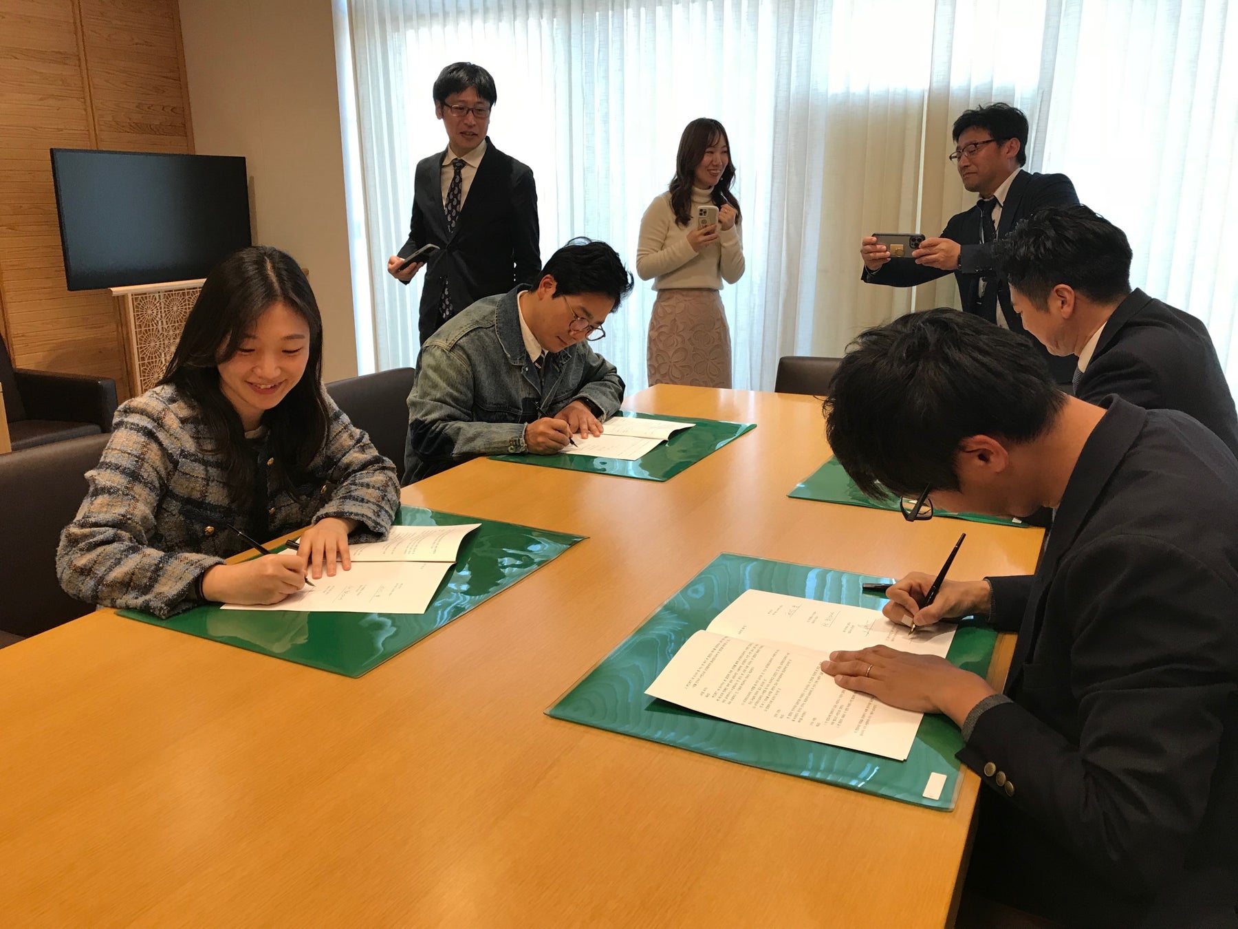 締結式には、催大泳(チェ・デヨン) 大象ホールディングス企業文化チーム長、趙庭賢(チョ・ジョンヒョン) 株式会社ホッパーズ代表取締役、西村賢 日向市長などが出席しました。