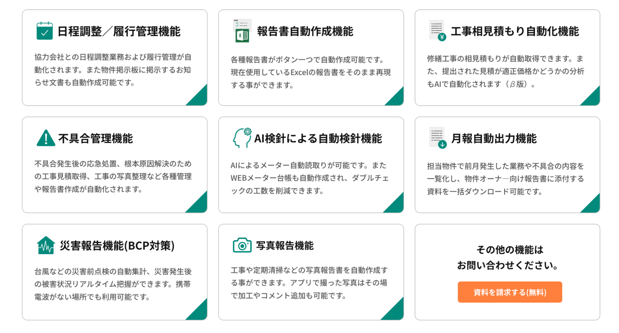 「管理ロイド」は不動産管理会社向けのAI-SaaSソフトウェアです。無料のアプリを使用して点検、検針、清掃報告などの入力を行えば、事務所への帰社後の報告書作成業務が不要になります。これにより、不動産管理実務のペーパーレス化、労働生産性の向上、遠隔確認などが実現できます。紙に起因する単純作業の削減により、労働生産性が向上するとともに、AIを活用した検針ミスの防止や履行管理の一元化により、業務リスクを軽減します。さらに、提出書類のダブルチェックなどをAIがサポートし、不動産管理の品質を向上させます。