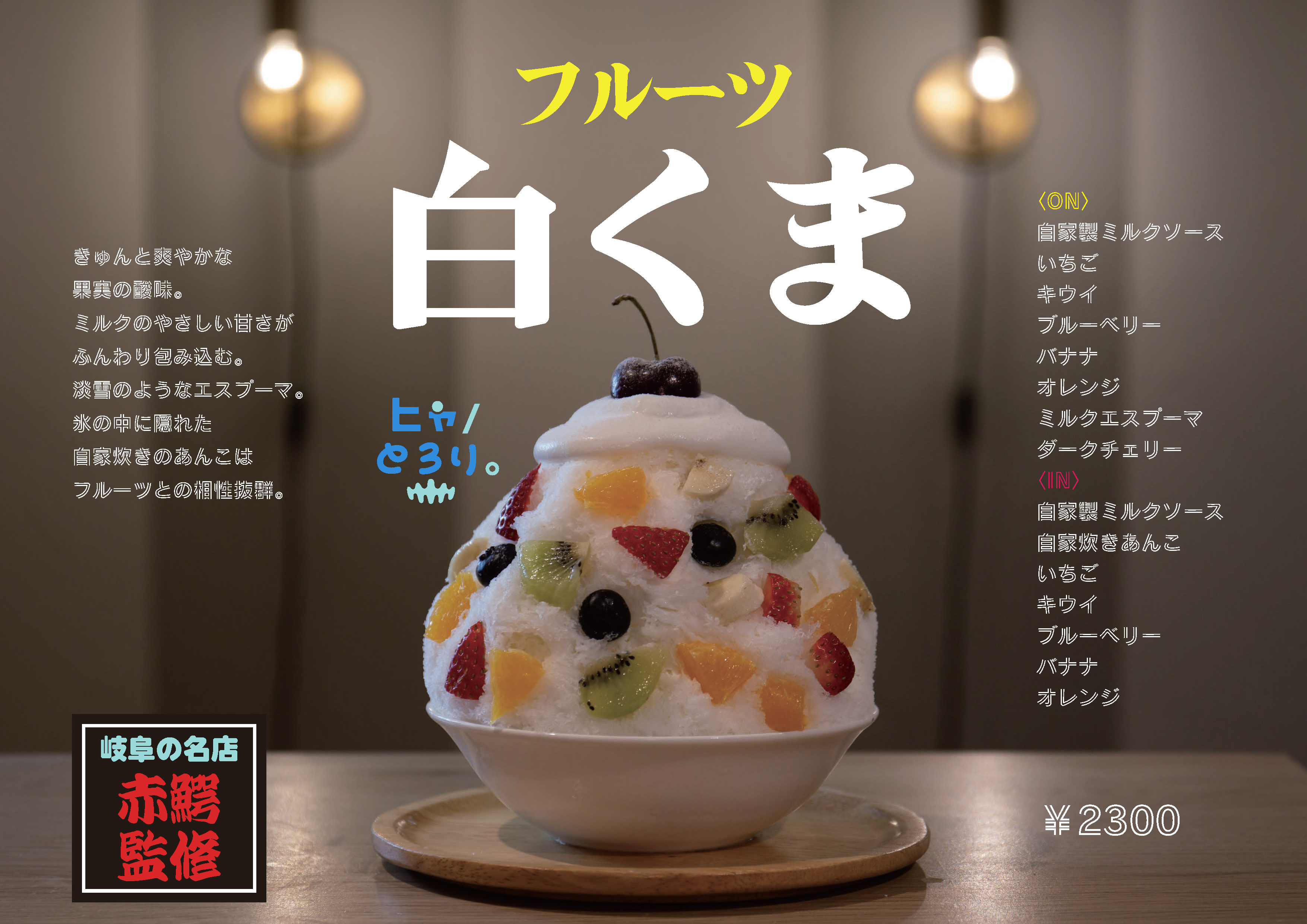 白×彩り。冬に味わう、どこか懐かしい一杯 「フルーツ白くま氷」ふわふわのミルク氷に、色とりどりのフルーツ、自家炊きの小豆、そして「ヒャ/とろり。」自慢の自家製ミルクソースをたっぷりとかけた冬限定のかき氷『フルーツ白くま氷』。