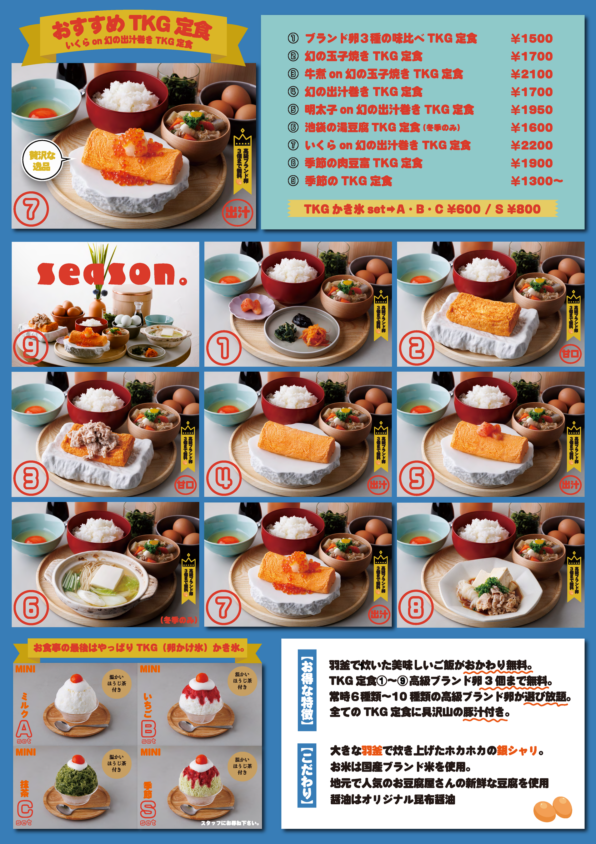 厳選したブランド卵の魅力を存分に楽しめる、卵かけご飯(TKG)専門店ならではの豊富なメニューをご用意しています。
