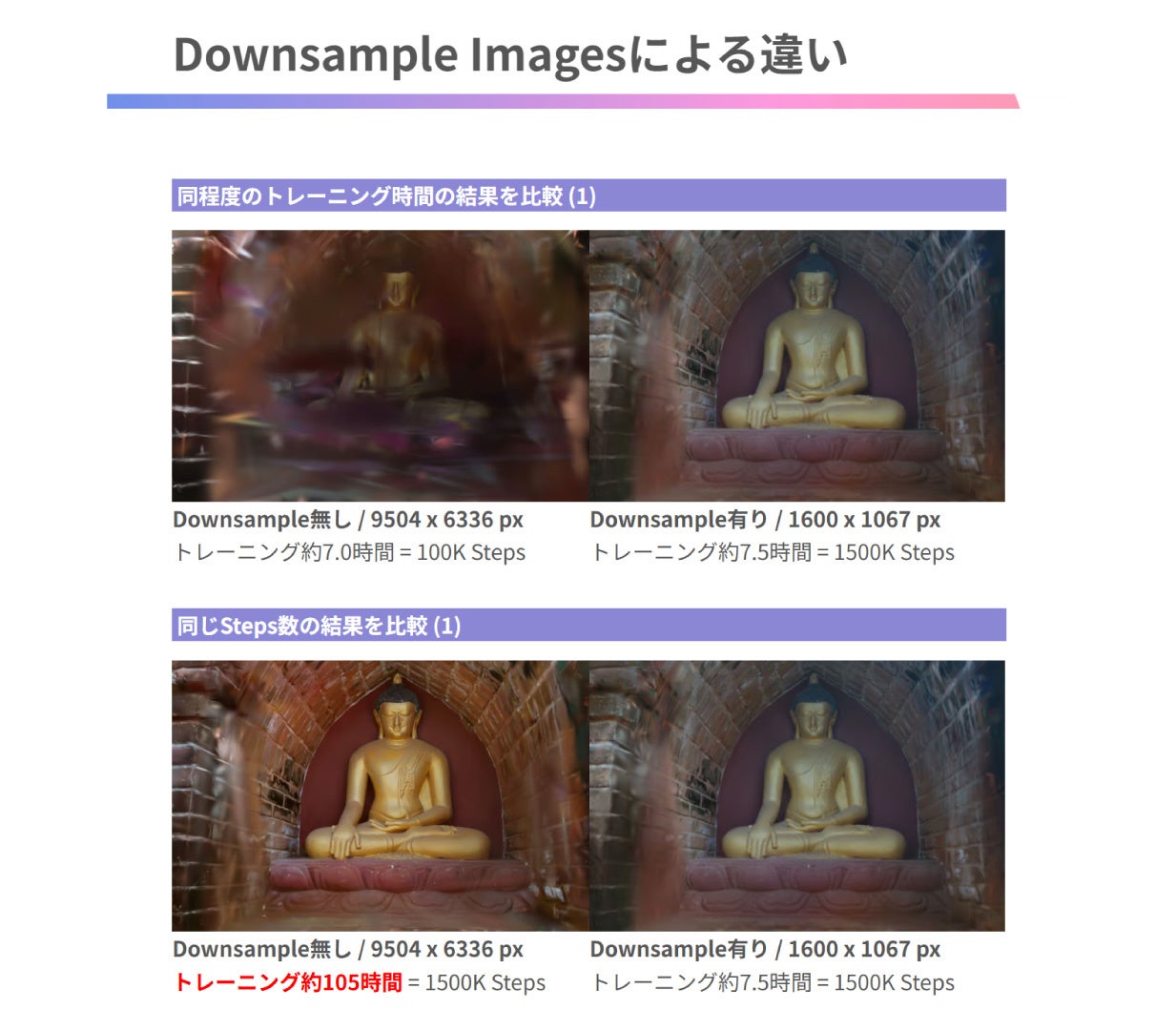 本資料ではRealityScanとPostshotを併用した3DGS生成までの手順に加え、設定ごとの処理結果のキャプチャ画像をまとめた511ページにわたる記録資料を公開します。