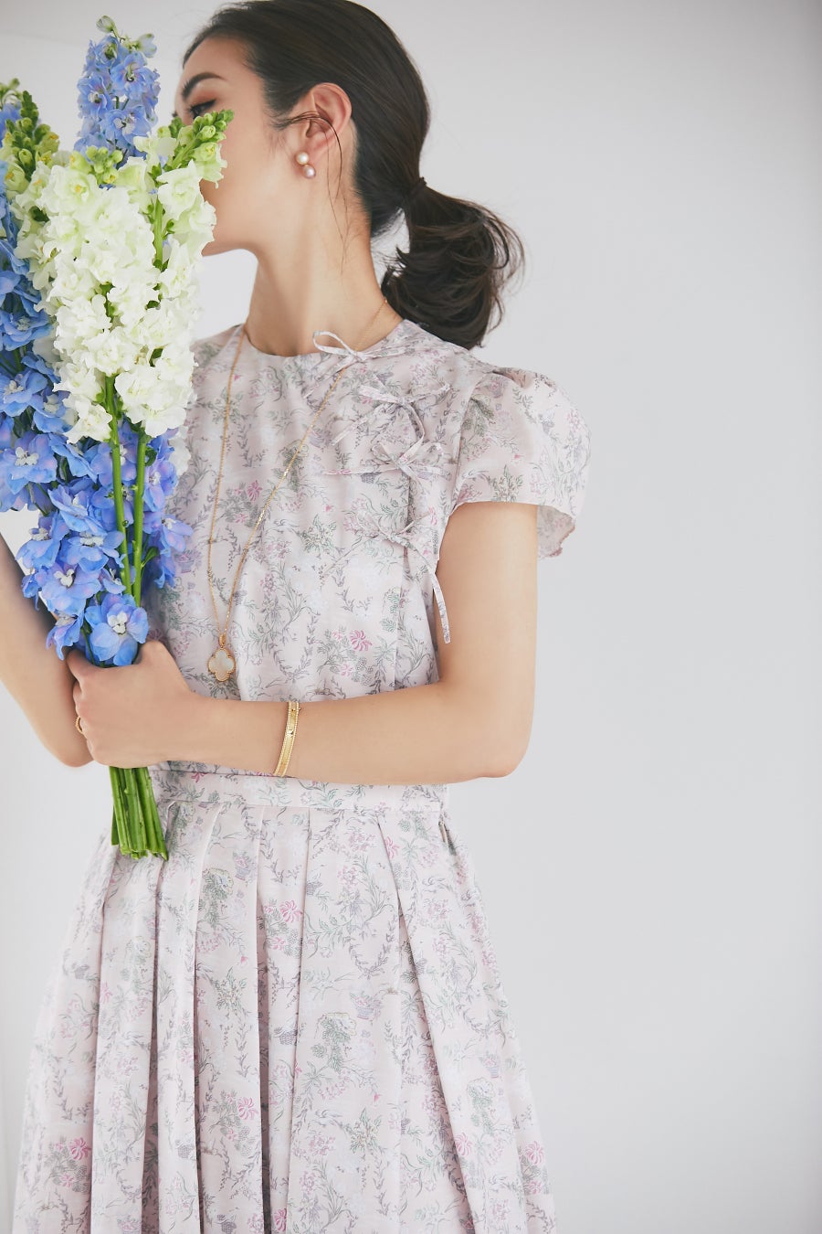 「中高生のころからKEITA MARUYAMAの大ファンです。かぎ針編みや贅沢な刺繍、シーズンごとに打ち出されるオリジナルプリント…唯一無二の可愛いシノワズリであるKEITA MARUYAMAは、夢のある特別感を持つブランドです。こういった贅沢な仕立てのお洋服が本当に好きなのですが、自分も娘を持ち、自分の着るものに時間をかけられないことも経験。そこで、KEITA MARUYAMAのもつ夢のようなかわいさ、敬太さんの素材へのこだわりも大切にしつつ着やすさやお手入れのしやすさにも着目し、気軽に日常で着られる欲張りなアイテムに落とし込みました。」