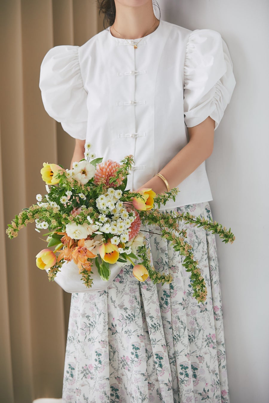 KEITA MARUYAMAのシグニチャーアイテムでもあるチャイナブラウスを大胆にアレンジ。ゴムシャーリングでボリュームを出した袖は、着こなしのポイントになり、長めの丈で気になる腕周りもカバー。フロントはチャイナノットの代わりにパールボタンを採用し、セブンテンらしいフェミニンな上品さをかけ合わせました。