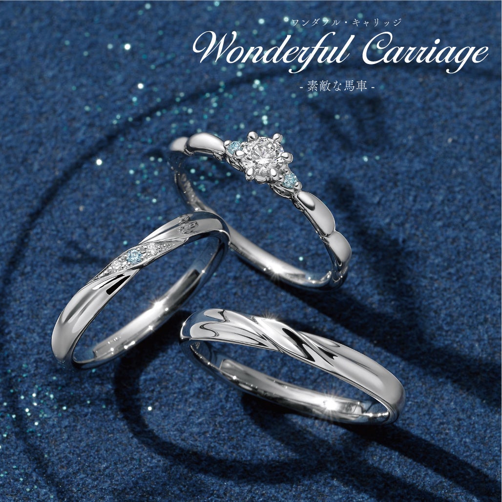 かぼちゃの馬車ともこもこのシルエットがキュートなエンゲージリングとシンデレラの夢を運ぶマリッジリングはプリンセス感溢れるとっておきのデザイン。