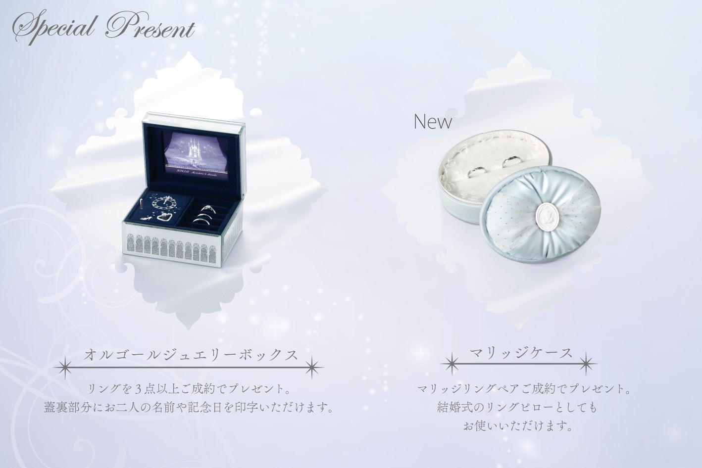 豪華な購入特典も人気です。今回は、20周年記念としてマリッジリングケースを、結婚式の際にもご使用いただけるリングピロー型のスペシャルケースへグレードアップしました。