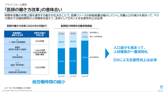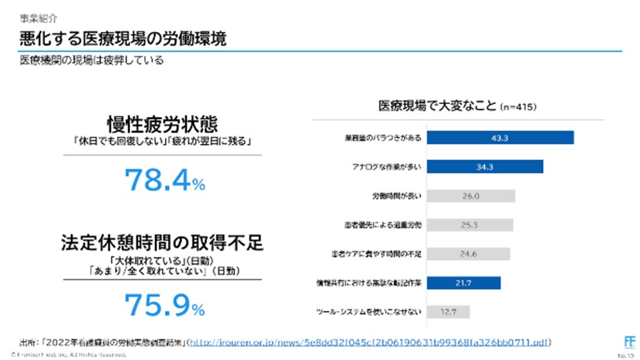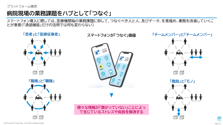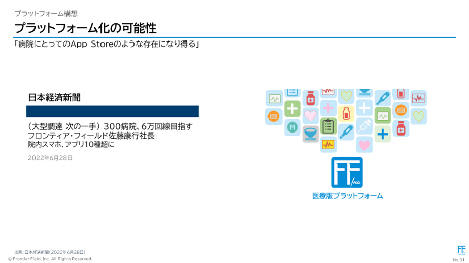「医療の情報革命によって全ての人々を幸せにする」をパーパスに掲げるフロンティア・フィールドは、医療機関のICTプラットフォーマーとなることを目指し、医療機関向けスマートフォン「日病モバイル」を開発、販売しています。当社に関するより詳しい情報は、公式HPをご覧ください。