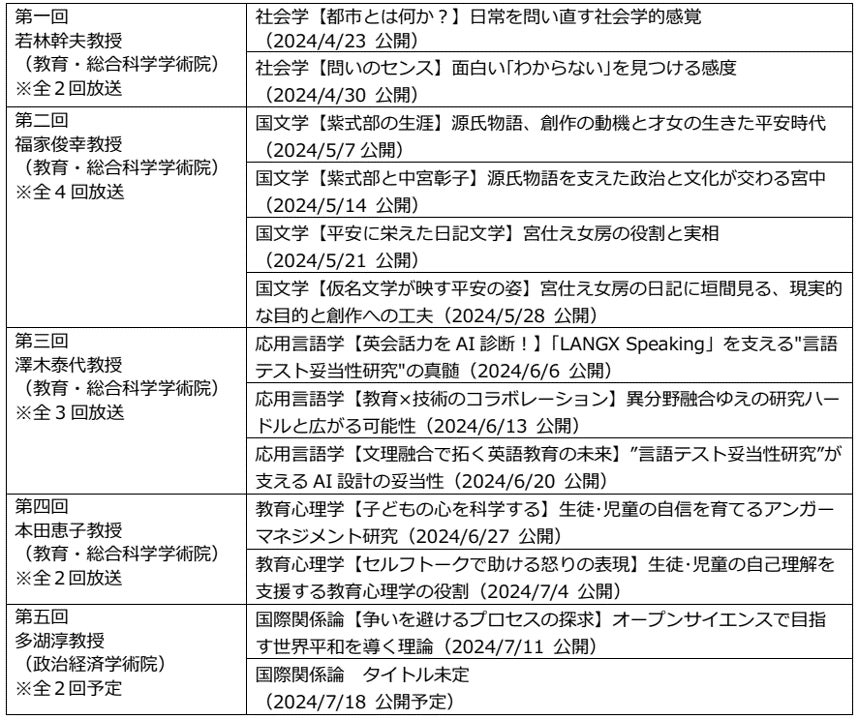 これまでのシリーズ『教育心理学:子どもの心を科学する! 実践主義を徹底したアンガーマネジメント研究/本田恵子教授』『応用言語学:文理融合で社会実装 言語教育のAI活用を支える言語テスト妥当性研究の真髄/澤木泰代教授』『社会学:世の中の前提を紐解く、社会学的感覚/若林幹夫教授』『紫式部の生きた軌跡・宮廷女房たちが映し出す平安社会の姿/福家俊幸教授』も番組HPより視聴いただけます。
