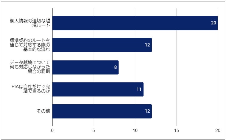標準契約については対象企業が一番多い適法ルートになります。適切な越境ルートはもちろん、全体的な流れ、対応しなかった場合の罰則、PIAについては自社だけで完結できるのか、などの課題を抱えていることが判明しました。