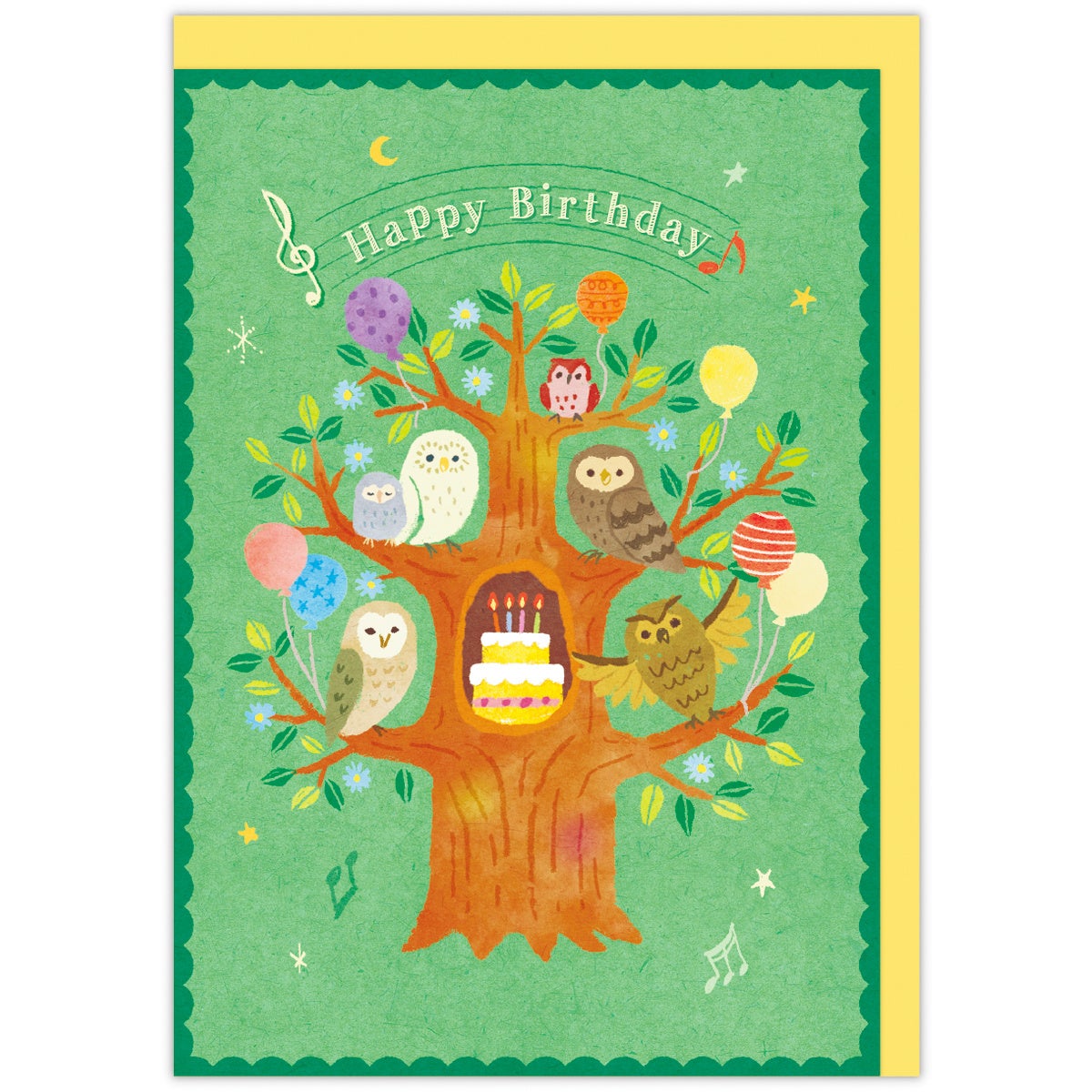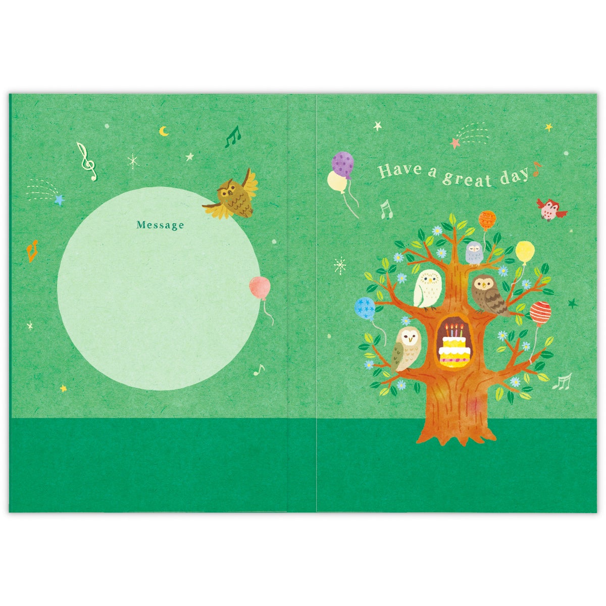 秋から冬にかけての季節感を意識し、温かみあるフクロウを描きました。落ち着いた緑の表紙で、男女問わず贈りやすい1枚です。バースデーソングは、2021年頃からSNSを中心に爆発的に注目を集めた楽器、アフリカのハンドオルゴール・カリンバの優しい音色でアレンジ。フクロウの鳴き声と相まって、森の中で穏やかな時間を過ごしているような気分になれます。