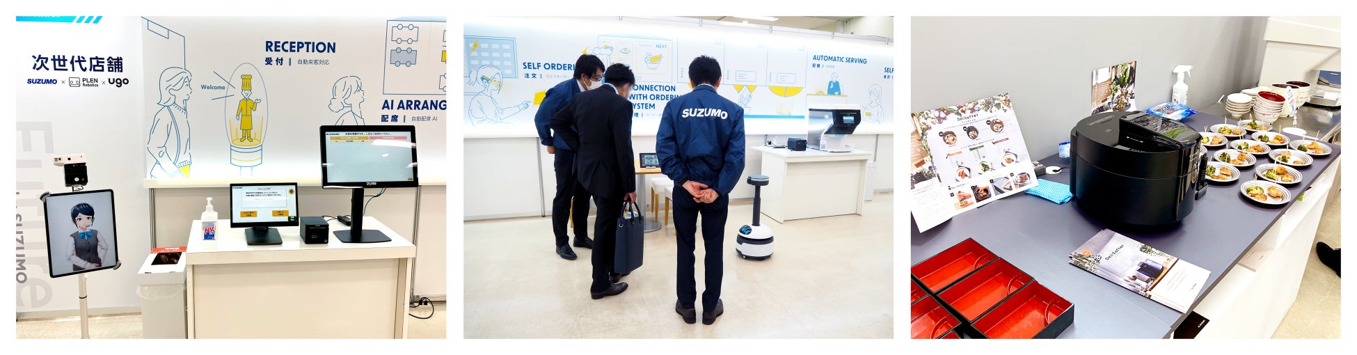 中でも、フューチャーゾーン内での次世代の飲食店をイメージした「Smart Restaurants by SUZUMO」では、 「キッチン」と「ホール」の2つのソリューションを持つスズモグループと顔認証ロボットの「PLEN Cube」を持つPLEN Robotics(プレンロボティクス)株式会社、業務用小型ロボットugo株式会社の3社のコンセプトモデルを展示しました。中でも「ugo mini」が初の動態展示となり、多くの来場者の注目を集めました。