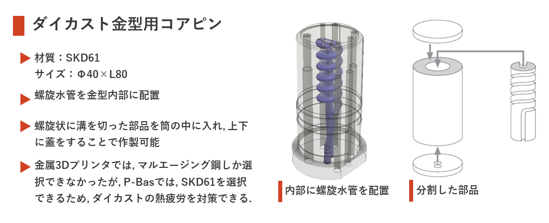 当社で開発したP-Bas接合は、金属 3D プリンタと同形状の部品製作が可能で、材料の選択肢が広く、強度やコストにも優位性があります。樹脂成型金型での活用に加え、ダイカスト金型やプレス金型への応用も可能です。