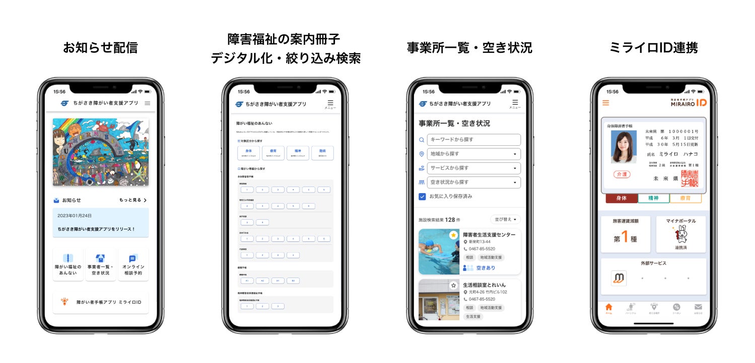 内閣府が推進する「デジタル田園都市国家構想推進交付金 *2」を活用し、ミラボが開発する「障害者支援アプリ」をベースに、同市のニーズに基づいた新機能「障害福祉の案内冊子 デジタル化・絞り込み検索機能」「事業所一覧・空き状況 検索」を備えた、茅ヶ崎市オリジナルアプリとして提供します。