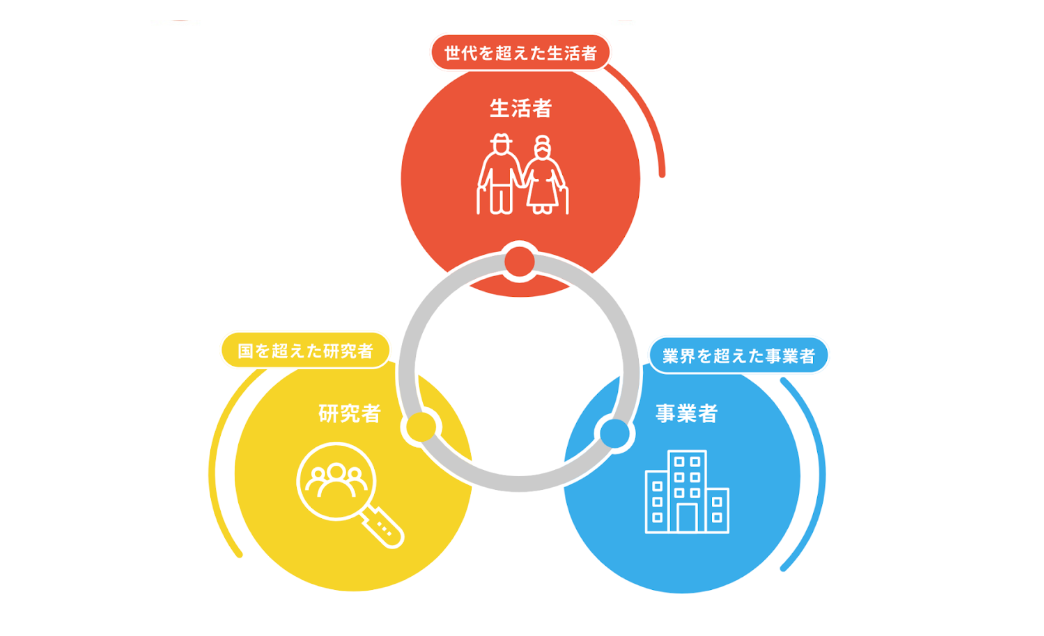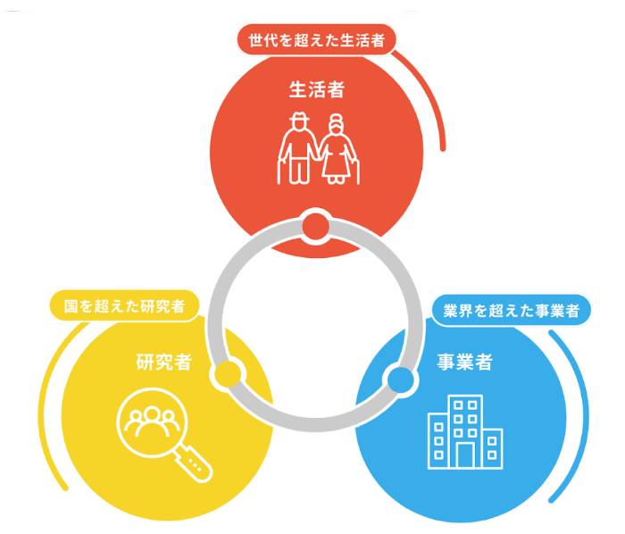 AgeWellJapan Labは、Age-Wellを実現する事業や社会システムの創造につながる研究ネットワークを目指します。そのため研究メンバーは、世代を超えた生活者・業界を超えた事業者・国を超えた研究者によって構成されています。