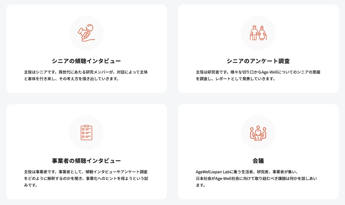 AgeWellJapan Labは横浜・二俣川駅直結のコミュニティスペース「モットバ!」を活動の拠点とし、以下の4つのアプローチで、シニアを取り巻く多様な領域の研究を行います。
