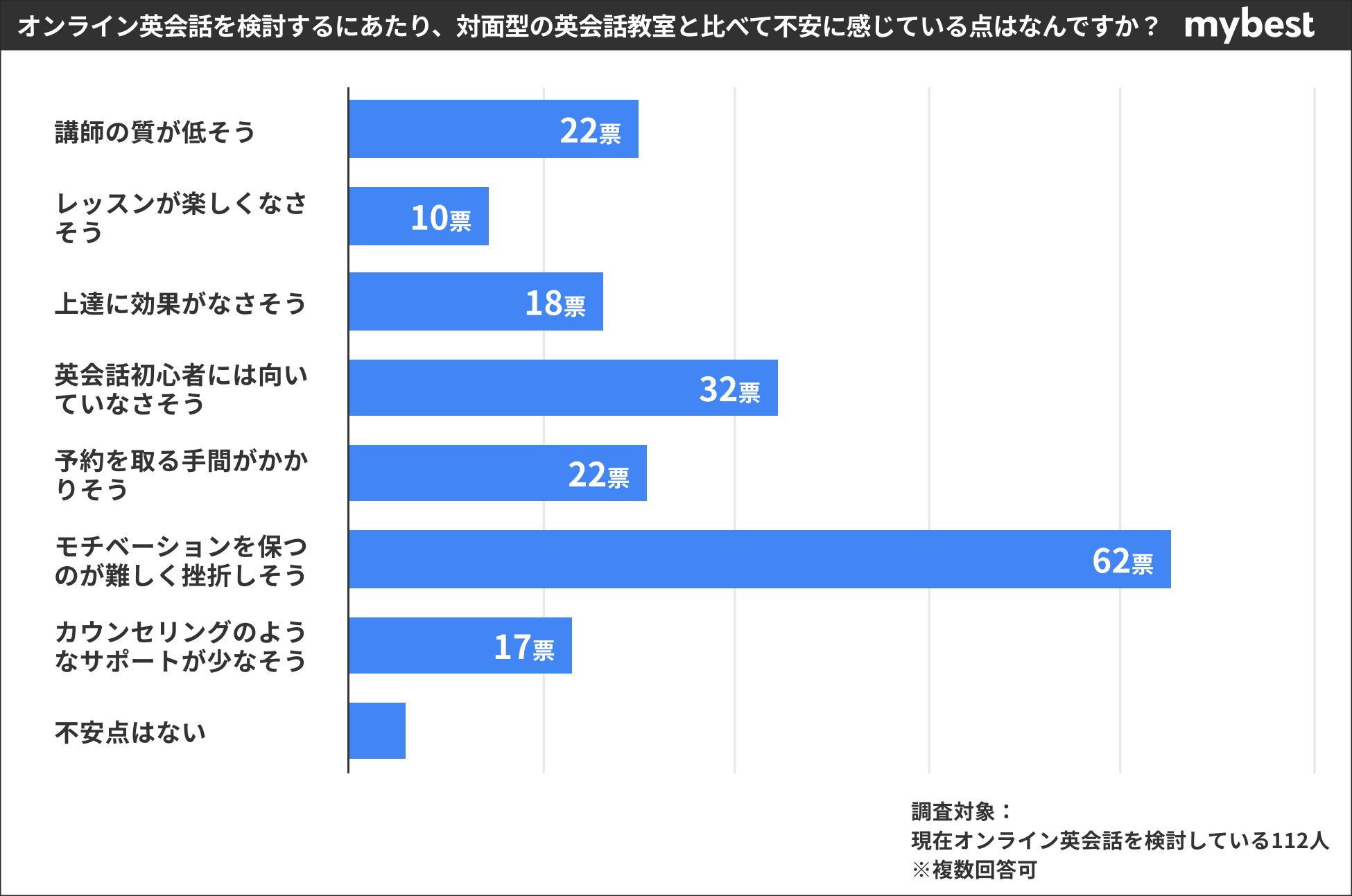 mybestではそんなオンラインでの英会話学習に関して、受講検討者が抱える不安点やオンライン英会話の評価要素を調査しました。