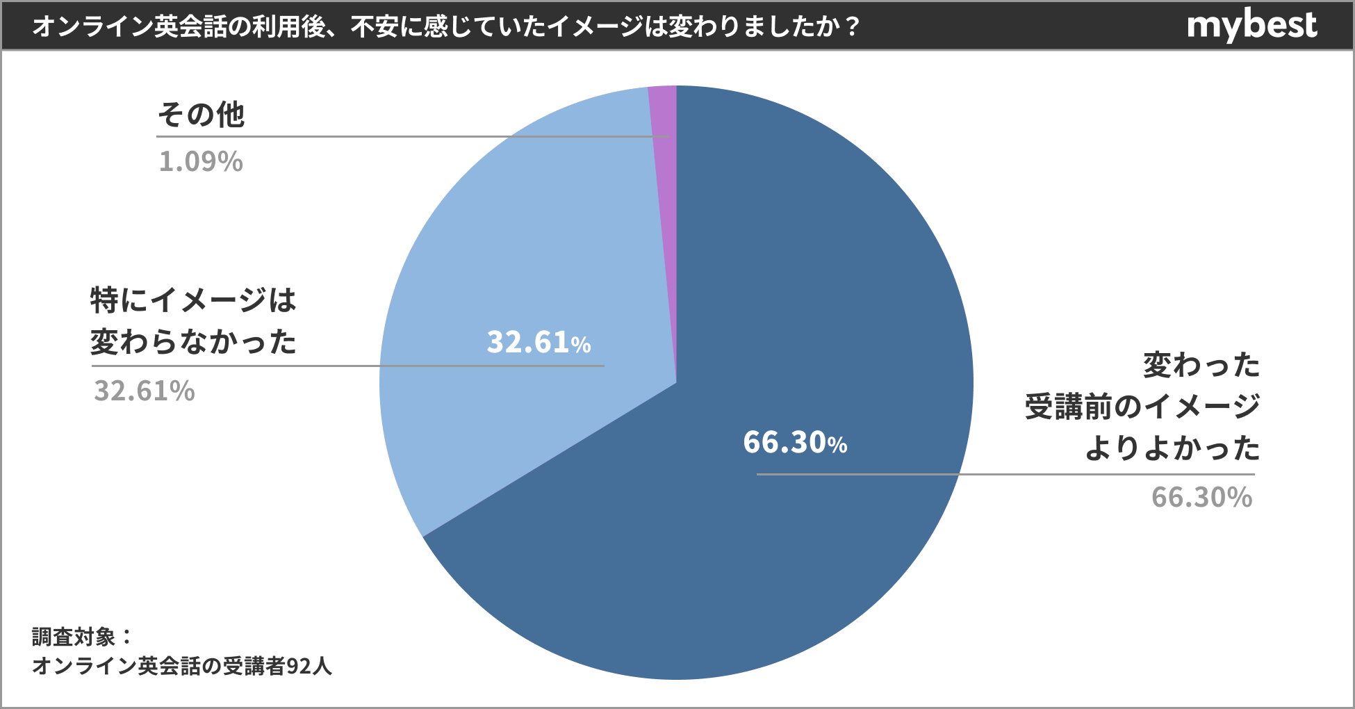 次に、オンライン英会話受講者92人を対象に、受講前と比較した受講後の満足度の変化を調査しました。その結果、61%の受講者が「オンライン英会話をはじめる前のイメージよりよかった」と回答。「レベルにあわせて先生が会話を引き出してくれた」「適度に褒めてくれてモチベーションがあがった」「講師と波長が合い、会話が楽しかった」など、未受講者が不安に感じているモチベーション面でも、講師とのコミュニケーションによって満足感を感じる人が多い結果となりました。