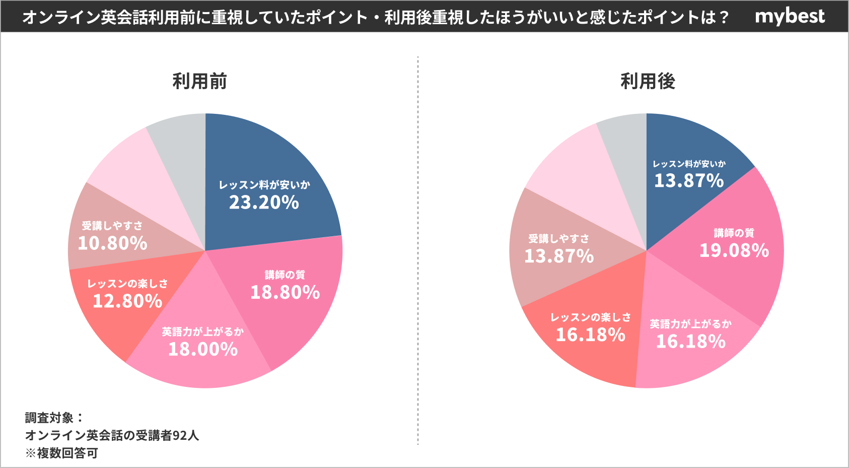 最後に、オンライン英会話を選ぶ上で重要視するポイントを、オンライン英会話受講者92人にアンケート調査しました。その結果、受講前と受講後では重要視するポイントが異なり、受講前に1位だった「レッスン料の安さ」を、受講後は「講師の質」が上回る結果に。また、「レッスンの楽しさ」「受講しやすさ」の割合が上がっているのも特徴的で、実際に受講した利用者にとって、レッスン料の安さより、講師の質や実際のレッスンの楽しさ・自由度の高い授業システムが、満足度の高さにつながりやすい傾向がうかがえる結果となりました。