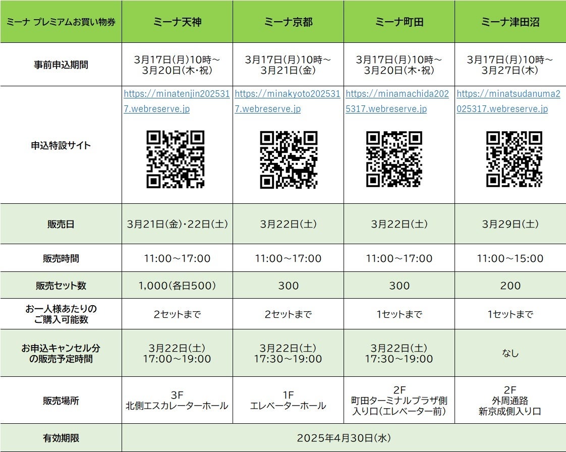 株式会社ファーストリテイリングが開発・運営を行なっているミーナ天神、ミーナ京都、ミーナ町田、ミーナ津田沼の4館にて、この春、日頃のお客様への感謝の意を込めて、3月17日「ミーナの日」を記念し、ミーナでご利用いただけるお得な「ミーナ プレミアムお買い物券」を数量限定で販売いたします。なお、ご購入には、4館ごとに特設サイトからの事前申込をお願いいたします(3月17日10時より受付開始)。