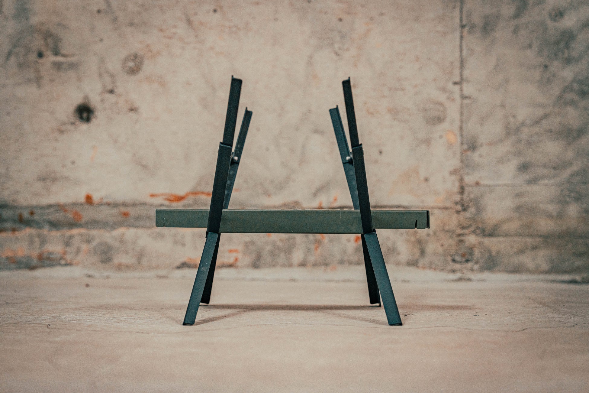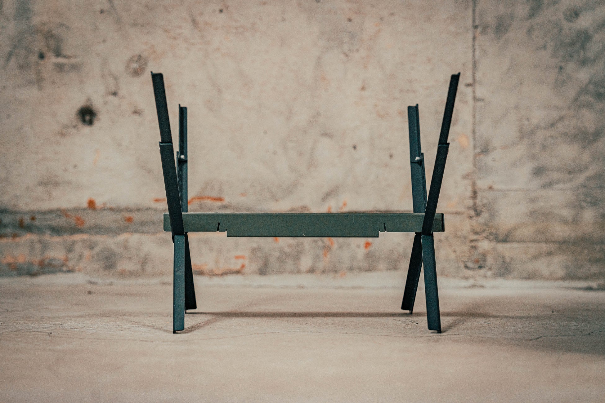 他社製品に多い布製の薪ラックとは一線を画す、メタルフレームのみのデザイン。