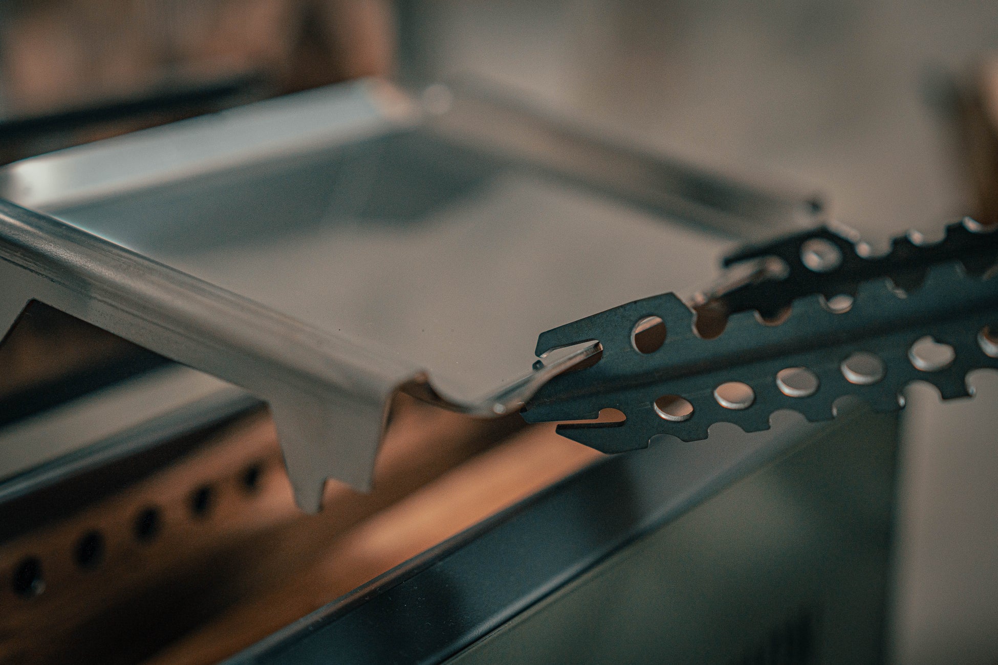 焚火台の中にも収まるサイズ感で、限られたキャンプギアスペースでも邪魔になりません。必要な時だけ展開し、不要な時は存在を感じさせない最適な設計です。