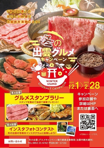 | 冬の出雲インスタフォトコンテスト | 令和5年1月1日~令和5年2月28日 | 公式インスタアカウントをフォローして#冬の出雲をつけて写真を投稿。入賞者に出雲グルメをプレゼント。 |
