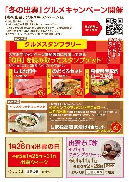 | 冬の出雲グルメスタンプラリー | 令和4年12月1日~令和5年2月28日 | キャンペーン参加店設置のQRを読み取ってスタンプをゲット。スタンプ数に応じて抽選で出雲グルメをプレゼント。 |