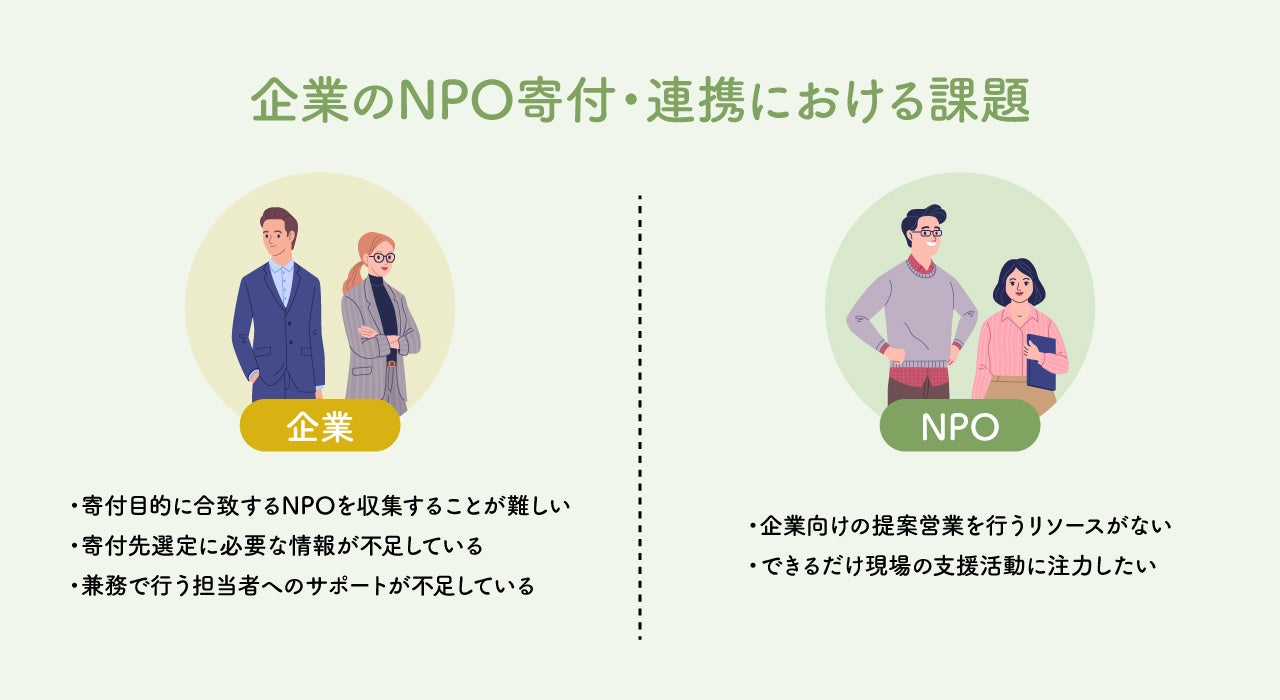 一方で、企業担当者からは「自社の本業に適した寄付先がわからない」「寄付先を兼務の担当者だけで選定するのは難しい」「サポートしてくれる専用サービスがほしい」といういくつものニーズが浮き彫りになっています。
