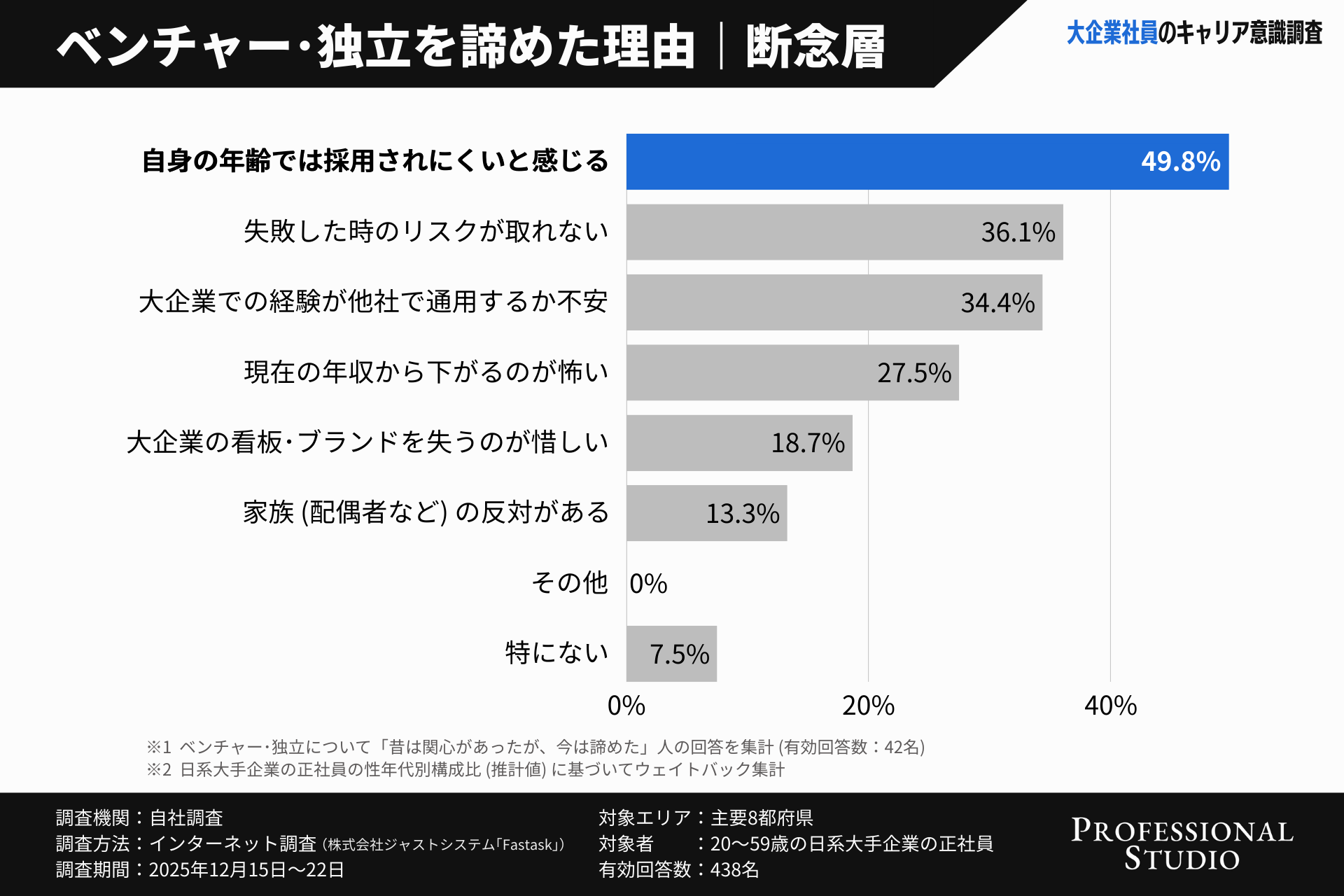 諦めた理由として最も多かったのは「自身の年齢では採用されにくいと感じる」で49.8%と約半数を占め、他の理由を大きく引き離しました。次いで「失敗した時のリスクが取れない」が36.1%、「大企業での経験が他社で通用するか不安」が34.4%と続きます。