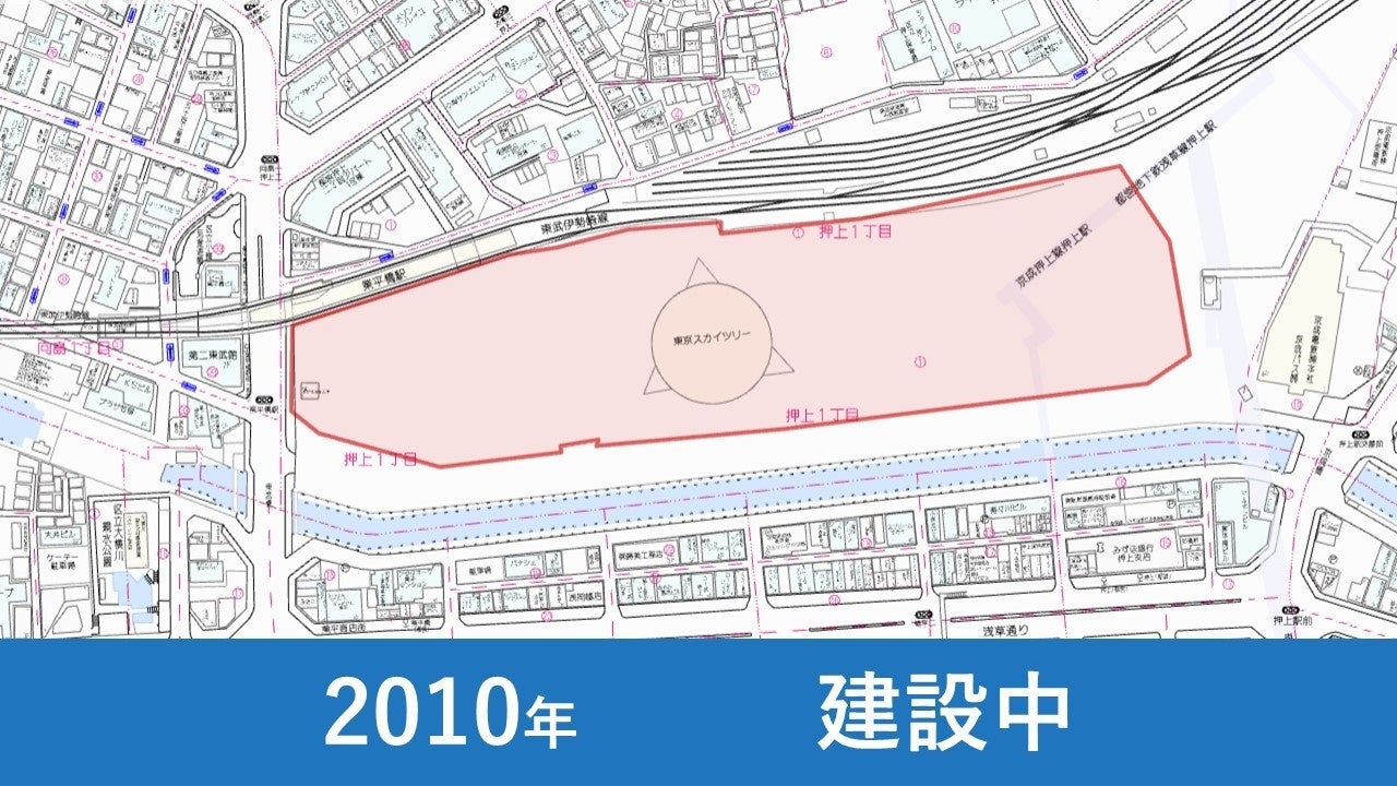 赤色の部分が、現在スカイツリータウンがある場所になります。1995年の建設計画前の地図は東武鉄道の貨物駅や、コンクリート工場がありました。2008年に着工が開始され、地図上で更地になっています。2010年は建設中ですが、ゼンリンは建設中の情報に関しても地図に反映をしております。2021年には開業しスカイツリー全体の情報が反映されました。このように変遷を地図上で可視化することが可能です。