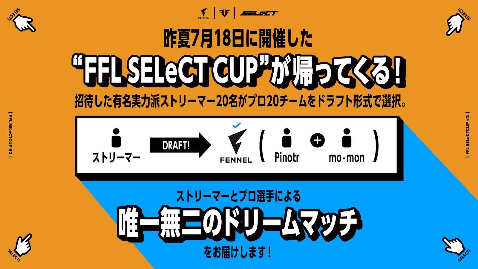 株式会社Fennel(所在地 : 東京都渋谷区、代表取締役社長 : 堀田 マキシム アレクサンダー、以下「FENNEL」)は、ストリーマーとプロプレイヤーによるドラフト形式のApex Legendsのコミュニティ大会「FFL SELeCTCUP#2」の開催を発表致しました。本大会は、一昨年12月29日に行われたFFL DRAFTCUP、昨年7月18日に開催したFFL SELeCTCUP supported by GALLERIAに続く、ストリーマーとプロプレイヤーがドラフトによってチームを構成する「ドラフト形式大会」の第3弾になります。前回大会に引き続き、eスポーツを仕事に繋げるプラットフォームサービスを提供する「SELeCT」様に特別協賛いただいての開催になります。