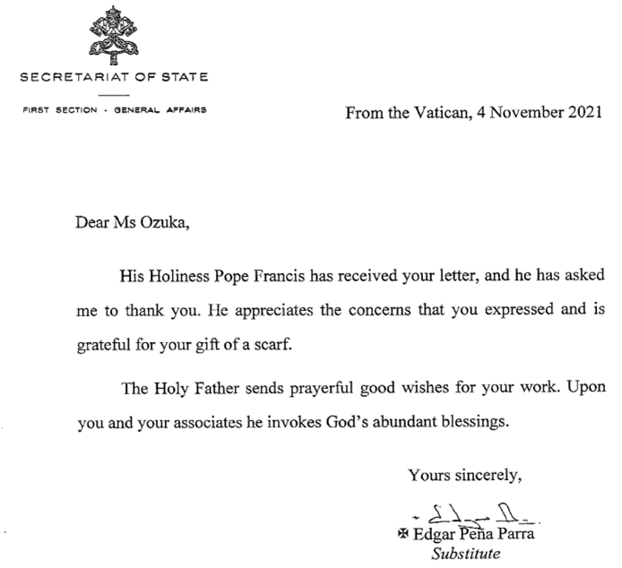 本スカーフはSDGsの取組として海外から注目をされ、先日贈呈先のローマ教皇から感謝状を頂いています。
