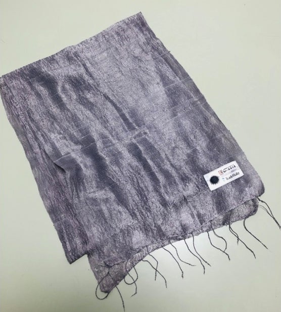 昨今、九州地方の一部でウニが増えすぎ、北上してきたウニが藻場を食べつくす事で、海底が砂漠化する「磯焼け」という環境問題が発生しています。その結果、海底を覆っていた藻場が減り、海底に直接日光(紫外線)が当たるようになった事で、海水温が上昇し、温暖化や海の生態系の破壊を加速させています。この事象を防ぐため、ウニの除去をしていますが、除去ウニの活用方法の1つとして出てきたものがウニの殻を使って染色したスカーフになります。