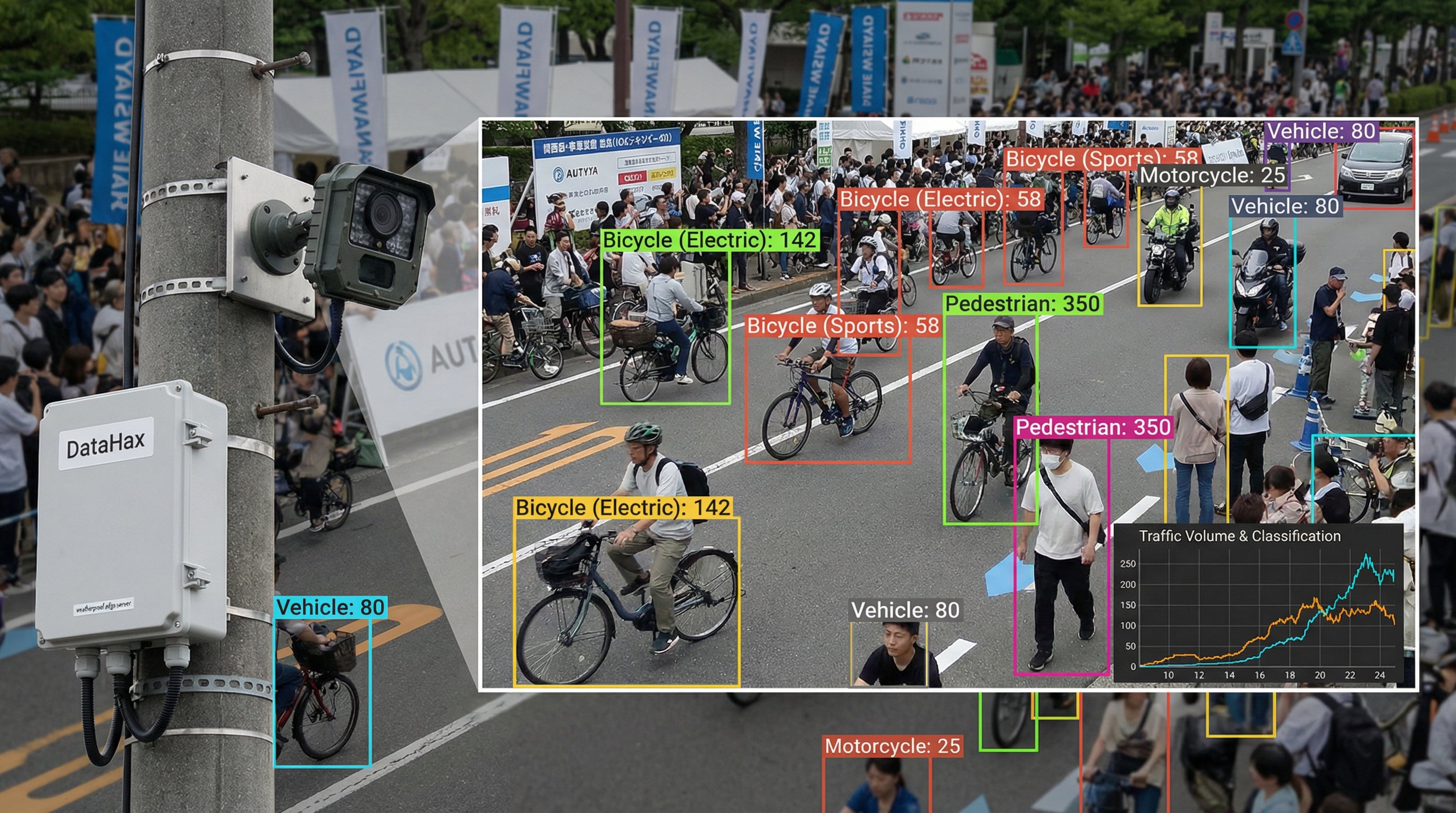 DataHax株式会社(本社:東京都新宿区、代表:大西 洋平太)は、関西地方で開催された大規模イベントの周辺主要道路(ロードサイド)にAIカメラとサーバーボックス(エッジ処理環境)を設置し、自転車交通量の計測および自転車種別・歩行者・その他移動体の分類解析を実施しました。物体検知モデルを現地データで個別学習することで、混雑や照明条件などイベント特有の環境下でも高精度な解析を実現しました。