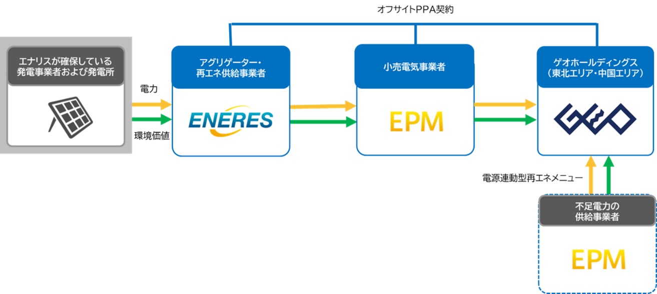本契約では、発電事業者と電力買取契約をあらかじめ交わしたエナリスが再生可能エネルギー供給事業者として入り、小売電気事業者のEPMを介して、東北エリア・中国エリア内のゲオホールディングス所有施設に再生可能エネルギーを供給します。オフサイトPPAで不足する電力は、EPMの電源連動型再エネメニュー[2]を供給することにより、ゲオホールディングス(東北エリア・中国エリア)の実質100%再生可能エネルギー化が実現します。